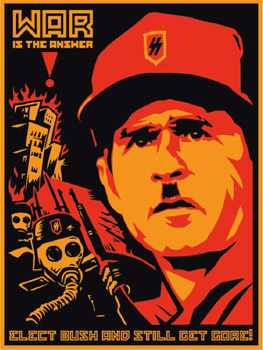 Jérôme Catz : Il dénonce, il ne va pas dire « Il faut faire ça ». Il va expliquer pourquoi il est contre Bush, ce qu’on fait avec le trésor américain, comment les Américains suivent aveuglément la presse… Il met Nixon sur le même niveau que Mao et Lénine alors qu’ils sont les pires ennemis de l’Amérique. Après, il a d’autres manières de faire avec des dénonciations beaucoup plus frontales. Dans la nouvelle expo sur l’art engagé à Spacejunk, nous allons montrer des œuvres très fortes et très frontales où il dénonce Bush et son administration en long, en large et en travers.