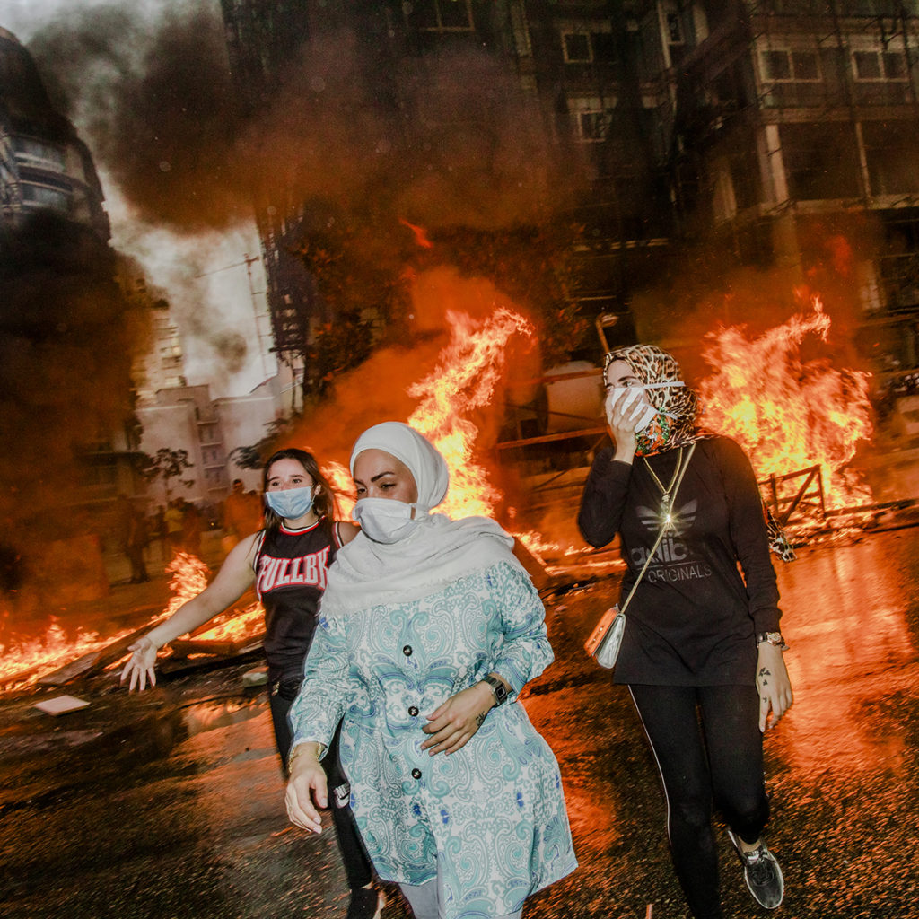 17 octobre 2019. Suite à l’imposition d’une série de taxes par le gouvernement, dont une taxe sur l’application WhatsApp, des centaines de milliers de libanais·es, femmes et jeunes en première ligne, descendent dans la rue pour exprimer leur colère contre un système et une élite politique et économique corrompue. Le mouvement baptisé thawra (« révolution »), qui défile pendant plusieurs semaines au rythme du slogan dégagiste « Keloun yaâ’ni keloun » (« Tous, ça veut dire tous »), inédit tant par son ampleur que par sa composition, est incarné ici par la photo de trois femmes masquées dans une rue en proie aux flammes qui illustre la pochette de l’album, réalisée par la photographe Myriam Boulos, que nous avions interviewée en mai 2020.