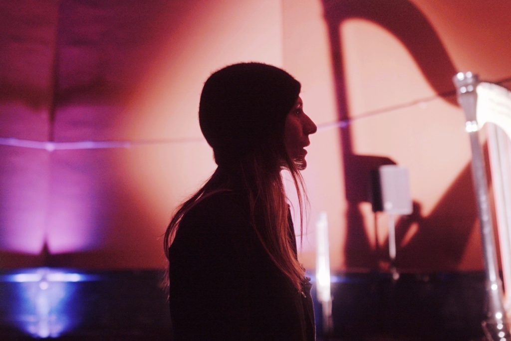 Après il y a quelque chose dans Leaving Room, que je ne veux pas perdre, c’est le fait de construire à vue. C’est plus par rapport à la scène, c’est lié à l’atelier. Je construis mes morceaux par couches successives. Le fait d’avoir fait beaucoup de théâtre, de venir de la scène, ça pour moi c’est très important. Il y a plein de matériels que je prends en charge. Ce n’est pas juste une harpe, une voix et de la réverbe. Il y a une grosse caisse, un clavier, maintenant il y a un ordinateur, il y a plein d’objets. Peut-être qu’un jour j’enlèverai tout ? Mais aujourd’hui j’en suis là. C’est plus vraiment dans le rapport à la scène. Leaving Room a été les prémisses de tout ça. J’ai commencé à ce moment-là à construire mes morceaux et c’est comme ça que j’ai commencé aussi à travailler avec Yoann. C’est ce qui lui a plu, le fait d’être dans quelque chose de constructiviste et en même temps, son travail c’est la recherche du point de suspension – il l’a trouvé, je crois…? – Il crée des dispositifs pour atteindre ce point-là. Et moi par couches j’essaye d’atteindre une suspension. Je pense que là-dessus on s’est rejoint et ça fait partie des débuts et je veux que ça dure.