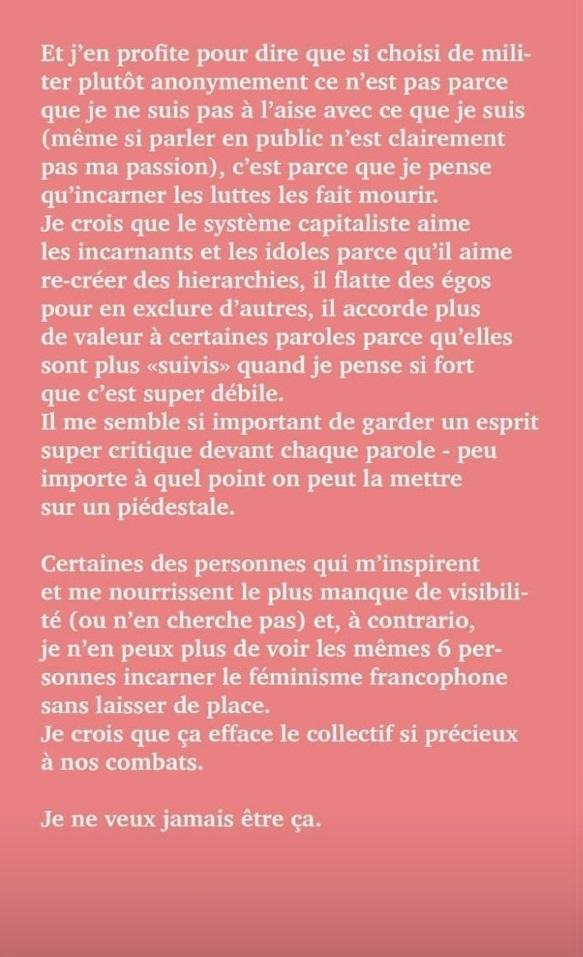 Tant que les rédactions, les académies, les élites dominantes, ne cesseront de minoriser la majorité de la population, Instagram restera l’un des seuls instruments pour impulser des débats autrement censurés. Débats qui, par ailleurs, sont bien souvent censurés y compris sur Instagram, comme le dénonce une tribune publiée sur Mediapart cette semaine (on se rappellera aussi de l’action de Romy Alizée contre la fermeture de son compte suite à la publication d’une photo considérée comme « enfreignant les standards de la communauté »).