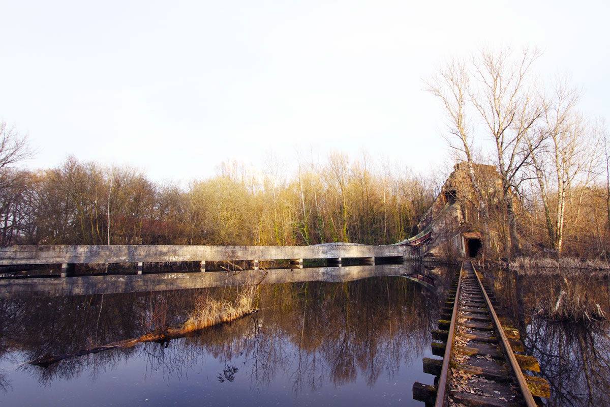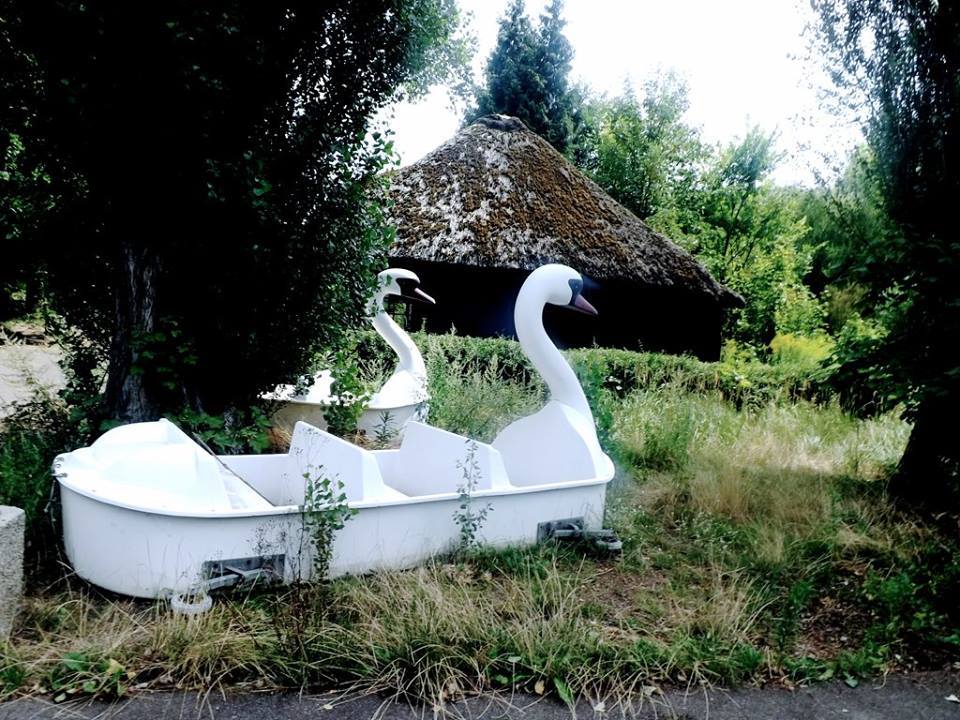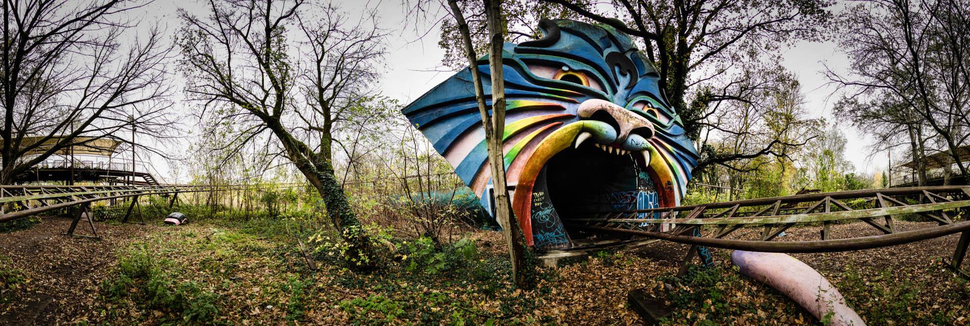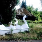 Durant une heure, dans un silence total, nous nous sommes promenés au milieu des attractions abandonnées, délabrées, nous avons retrouvé des wagons de montagnes russes dans des arbres, au milieu des buissons, des pédalos en forme de cygnes perdus dans les allées du parc, des rails de montagnes russes grignotés par les branches des arbres de la forêt encerclant le site.