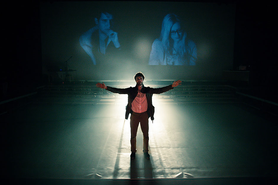 Julien Gosselin nous offre une œuvre d’art totale, dans laquelle s’ajoutent à la performance des comédiens des procédés scénographiques originaux : lumières, bien sûr ; mais aussi musique en live, puisque les comédiens eux-mêmes créent sur scène un fond sonore adapté à certaines scènes, ajoutant à ces dernières un potentiel dramatique phénoménal ; vidéo, avec des projections de phrases de l’ouvrage de Michel Houellebecq ainsi que d’images permettant une mise en abyme de la parole des comédiens, des projections de mots ou de dates soigneusement choisis venant concrétiser la parole, ainsi que des projections des comédiens en train de jouer, dans une sorte de reportage filmé s’élaborant en parallèle de l’action et venant l’expliciter ou la rendre intelligible. Des micros s’ajoutent à la parole des comédiens qui s’adressent directement aux spectateurs : l’histoire est à la fois en train d’être jouée, commentée et inscrite dans l’histoire dans le même temps.