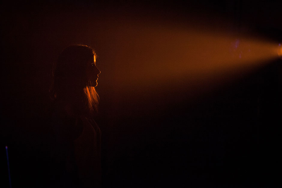 Un exemple de cette mise en scène audacieuse et percutante ? Peut-être le récit des atrocités commises par David di Meola et sa secte, vues comme des conséquences directes du mouvement hippie, en passant par les beatniks et les serial killers. Le discours est supporté par de la musique, jouée en live par les comédiens. La montée en puissance de la musique accompagne la montée en puissance du discours. La comédienne crie, elle hurle son histoire, son message, avec derrière elle des mots, des images qui s’affichent, dans une atmosphère baignée d’une lumière rouge. Elle hurle la violence, la cruauté, la barbarie, et plus sa voix s’élève, plus on se suspend à ses lèvres. Les mots résonnent en nous, on tremble en imaginant ce qu’elle évoque. Sa voix nous environne, nous envahit, nous enveloppe, nous transperce. Mon monde se résume à ce moment-là à cette femme sur scène, à ces mots qu’elle déclame, à ces images qu’elle fait naître dans mon esprit, à cette souffrance qu’elle déverse, à cette musique qui résonne autour de moi.