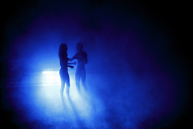 Un autre exemple ? Probablement cette magnifique scène où étaient présents sur le plateau un homme et une femme, deux corps nus, que l’on ne voyait que sous forme de silhouettes découpées sur la lumière bleue et la fumée. Deux corps qui dans une beauté, dans une poésie presque insoutenables, s’approchaient et s’enlaçaient, baignés par cette atmosphère bleutée.