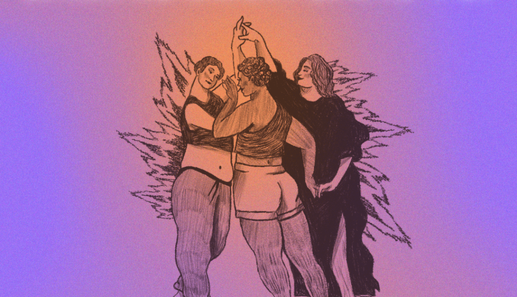 Je considérais vraiment qu’il y avait quatre relations qui se jouaient au même moment. Il y avait celle entre Marine et Aurélie, celle entre Aurélie et moi, celle entre Marine et moi, et la relation de trouple, qui avaient chacune des dynamiques différentes. Et ce que je retiens, c’est l’intensité. Toutes les deux, vraiment, c’était d’être piles électriques. Elles s’arrêtent jamais, jamais. Et j’ai adoré ça. Ça m’a un peu rendu·e accro, c’était comme de la drogue. Et c’était beau. C’était fort. C’était tout le temps très fort.