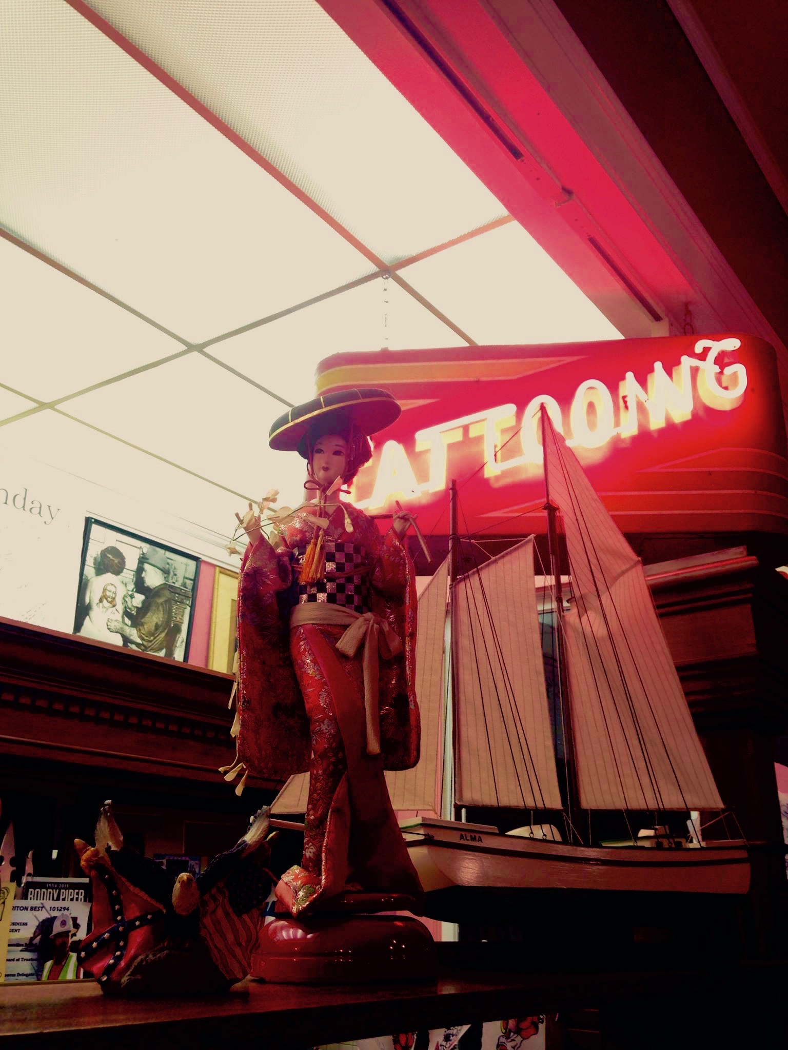 La commande est routinière : une tête d’aigle comme sur ses anciennes cartes de visite, mais surtout, le label Lyle Tuttle. J’écoute les conversations d’une oreille, occupée à prendre mes photos, des photos de ses photos étant jeune, et à m’imprégner de cet instant magique, voyage dans le temps, de la Seconde Guerre mondiale aux Hippies en passant par le Rock’n’Roll. À cet instant, bercée par toutes ces histoires, je n’aurais pu imaginer un San Francisco plus cliché.
