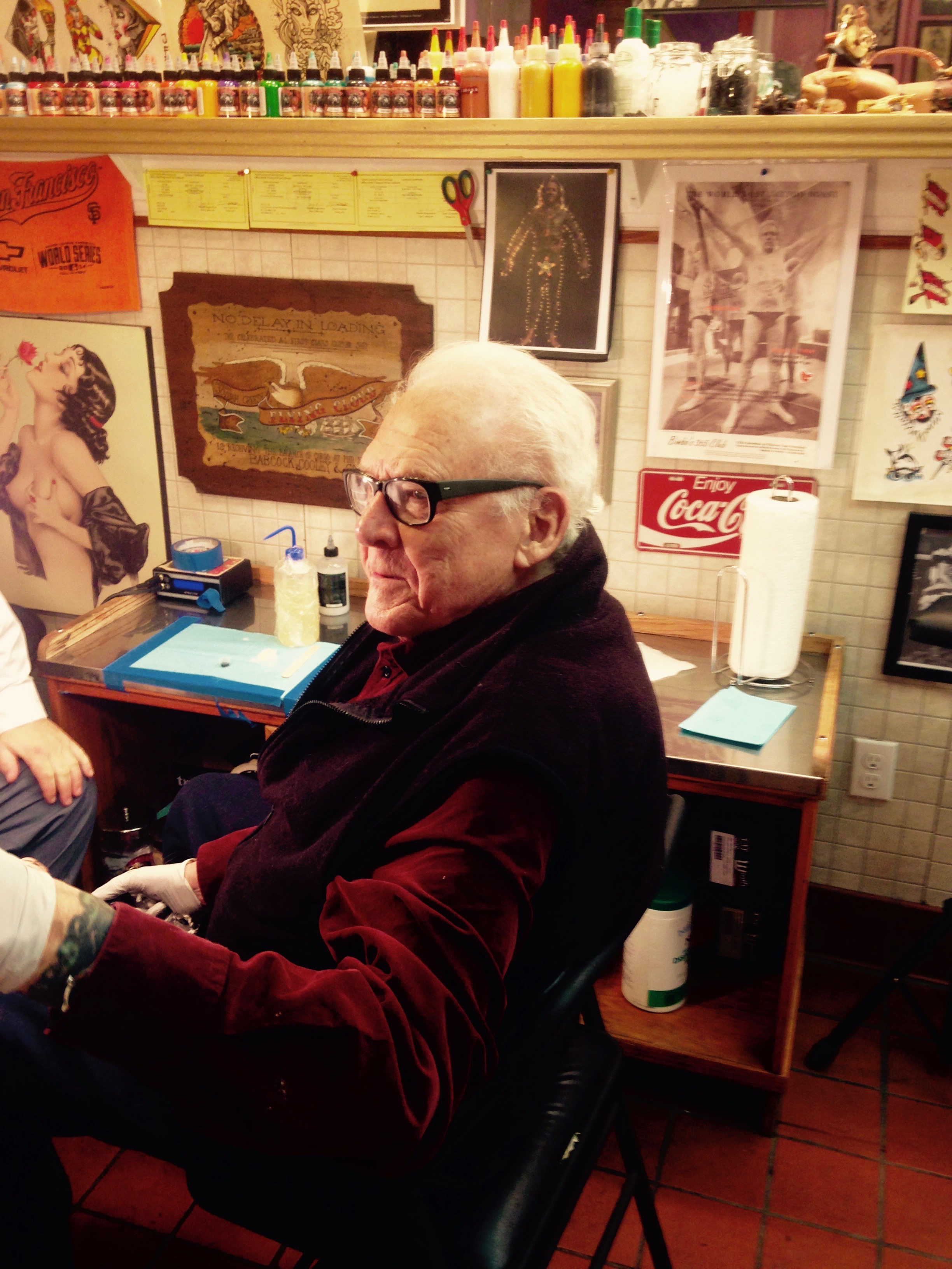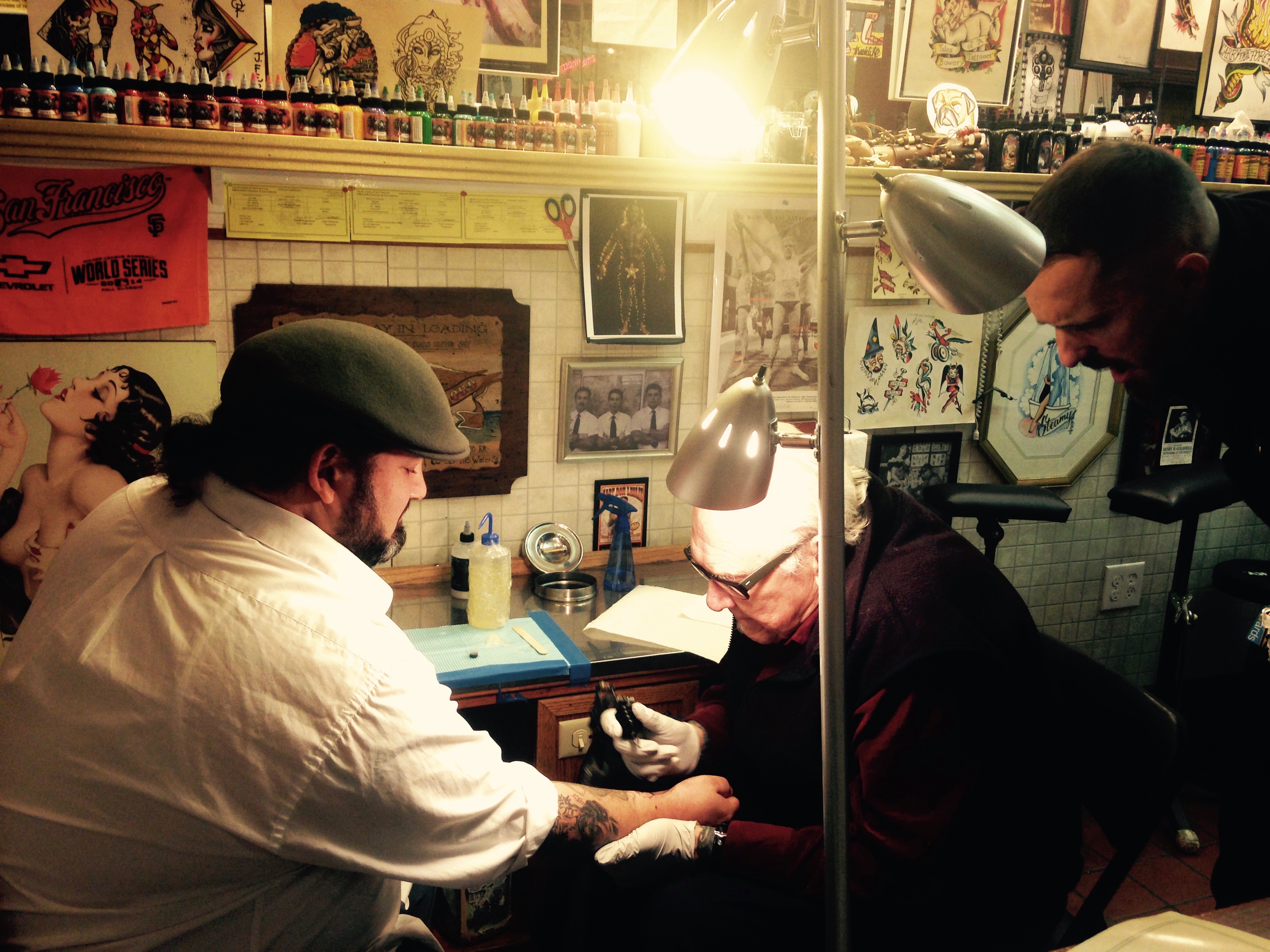 I got my first tattoo when I was 14. I came down from Ukiah on the bus. My parents gave me their OK to take my day trip and come down. The war had just ended and I kept seeing all these guys coming home with tattoos, but it was never my intention that day to come down to get tattooed. I just came down to see the Big City (cf. San Francisco). I got off the bus that day and made sure to stay close for fear of getting lost. I was only fourteen, you know, I didn’t want to get lost! Then I saw the sign with the magic word T.A.T.T.O.O. Inside, I saw all these designs on the walls. The tattooer yelled at me: “Hey! What the hell do you want?” At fourteen years old you can’t do many things, you can’t have a drink, and you can’t do this, you can’t do that. I went “Babababa”, like a shy little boy. I pointed out a design; it was a heart with “Mother”. It was put on in about five minutes. Boom Boom Boom. Very quick. On my way back home, it was very dark, the bus didn’t have any lights in the inside of it. I could feel the tattoo but I couldn’t see it. I would lose the tattoo in the dark and think it wasn’t on my arm but then the street lights would hit it and I’d say to myself “I have it, I have it!” Well, it was like a sticker on my luggage, a sticker from San Francisco. So from that point forward I wanted to be a tattoo artist. I went back to the city and began talking to other tattoo artists trying to make friends but ended up just hitting a wall. There was a tattoo artist in San Francisco named Pop Eddy who was the brother of a man who worked with my father. When I told him who I was and that his brother worked with my father, he agreed to teach me. He said “yes it’s my brother!” It was my aim. You had to have somebody teaching you, it was a secret art form. There were no magazines, no conventions, it was a clandestine, underground art form. So I got some equipment from him and he gave me some instructions. Nowadays, there are hundreds of books about tattoo history, you go on the Internet and just Google it. You have these TV shows, they deliver wrong information to the tattoo customers and they take the mystic out of tattooing.