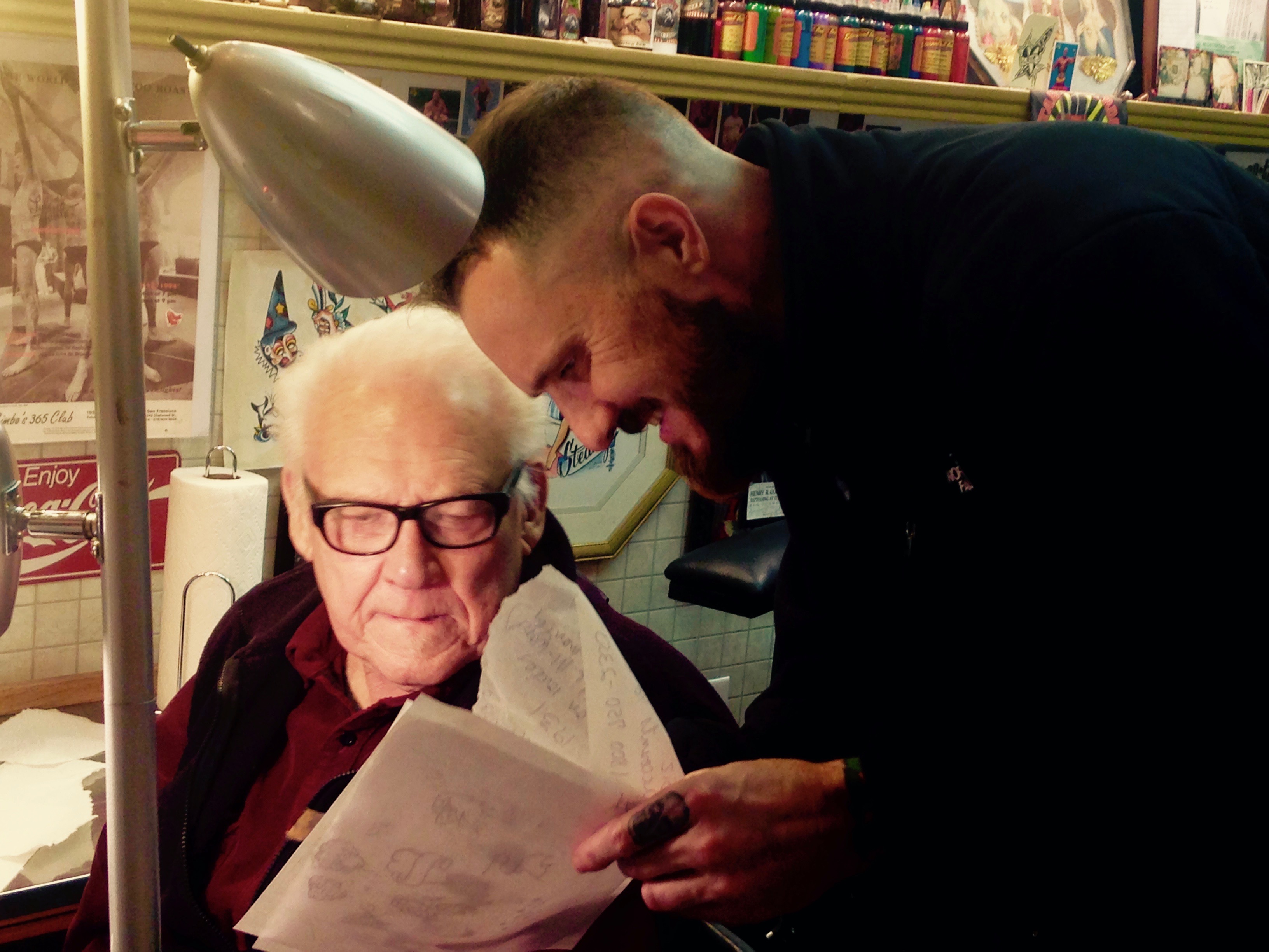 Concerning the designs, I don’t really work in the shop everyday so I don’t really know the designs people are picking now. What I do is put small pieces on collectors who just want something from me. Usually eagles, butterflies and sometimes dragons. Tattoo is an external decoration for eternal feelings. I’ve been tattooing for sixty-five years, spent thousands of hours sitting in that chair drawing pictures on people. I love the lifestyle and the people. It’s like working in a nightclub. I love my job. I usually put tattoos on people and they don’t care what they get as long as they get a tattoo from me. Most of the time they just ask for an autograph.