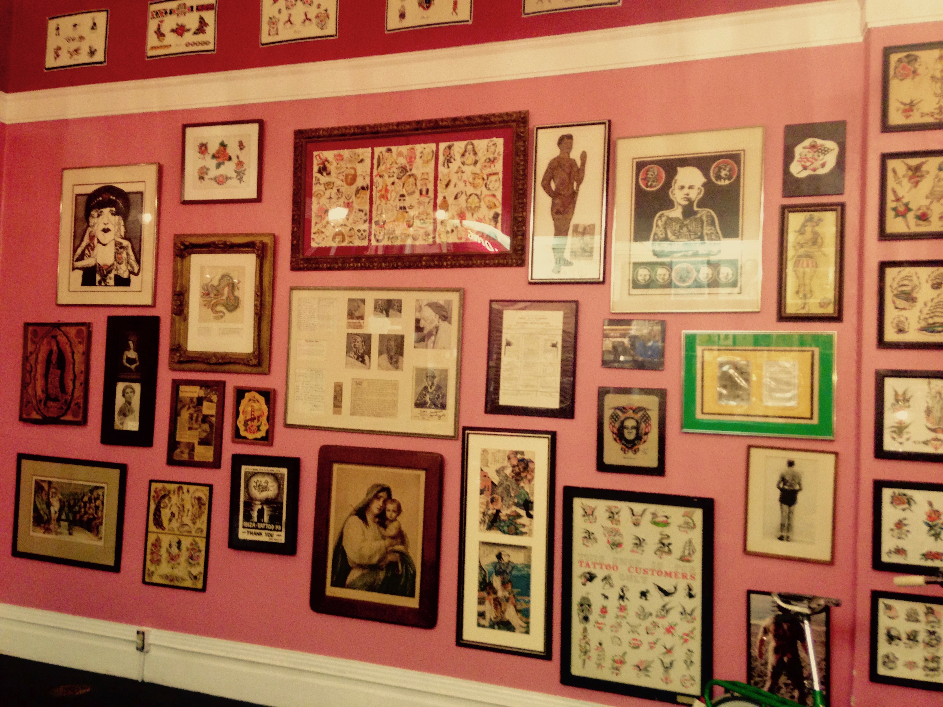 Je découvre alors des murs rose ancien tapissés de planches de tatouages.