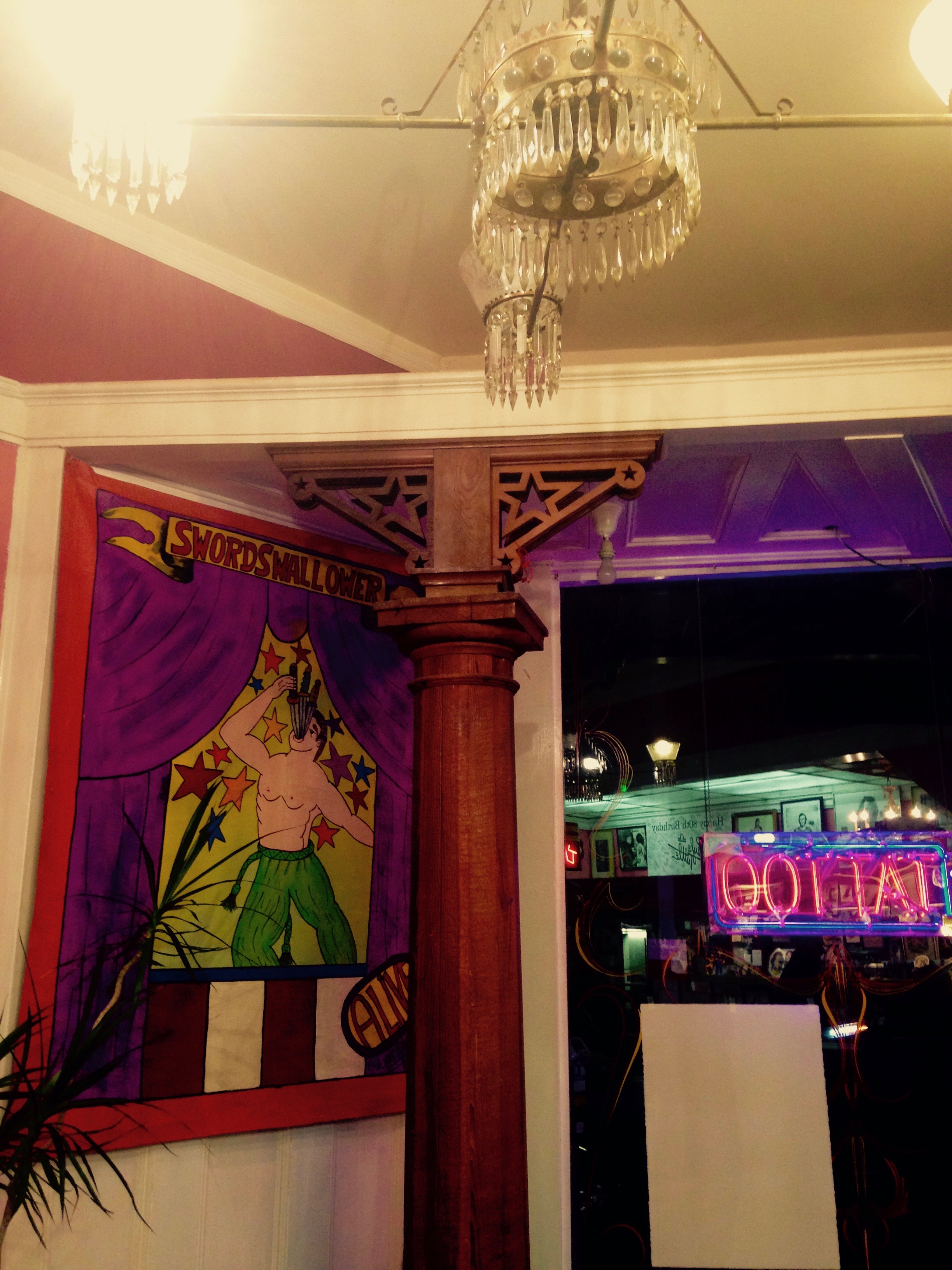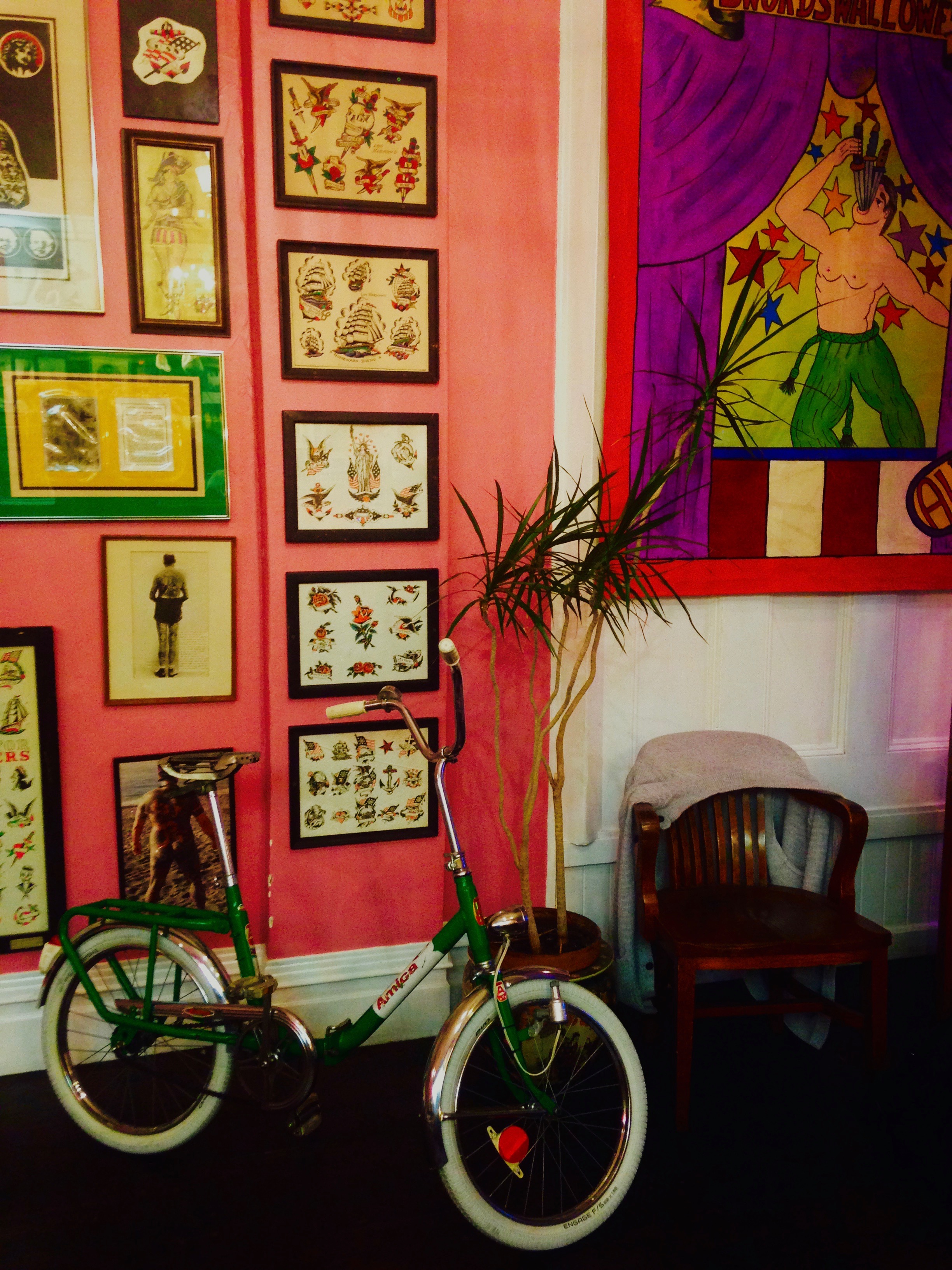 Deux tatoueurs, accoudés au comptoir semblable à celui d’un pub se tournent vers moi : « Hey, how are you doing ? » « I’m fine, and you? » « Great! ». Les yeux imbibés de couleurs, de tattoos vintage typiques américains, de corps de pin-up que l’on se grave sur la peau, d’aigles, de papillons, d’indiens et de dragons, je complimente les tableaux et peintures murales. « Thank you! Are you on vacation? », me répondent-ils. « I’m in internship for six months » « Oh nice, where? » « In an art gallery not so far! » « That’s cool! As you see this place is between an art gallery and a tattoo shop! Our boss opened it in the sixties, he’s eighty years old now but he still tattoos people sometimes! ». Je les remercie, leur dis à bientôt, que je repasserai à l’occasion.