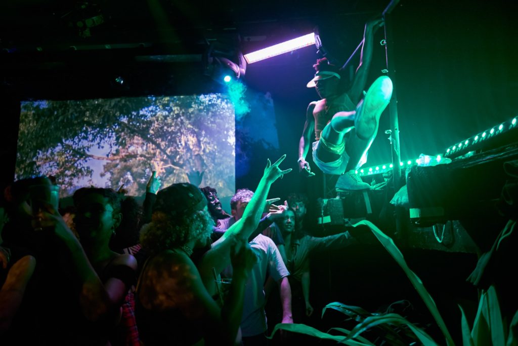 Pour « Maraboutage Airlines », la team a profité de l’agencement du Makeda pour placer les platines sous la mezzanine, dissimulant ainsi le/la DJ, afin de laisser la scène aux performeur·se·s et au public. Une « fête 360 » qui offre un espace de liberté d’expression qui manque parfois dans les lieux de nuit étriqués du centre-ville.