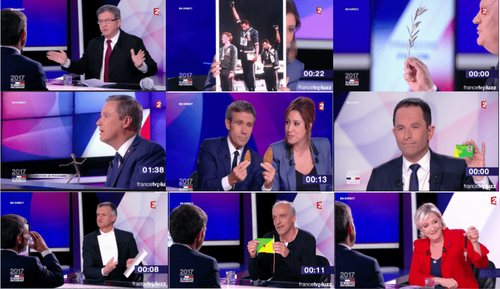 Les objets sont l’occasion de rappeler le populisme de Marine Le Pen et Nicolas Dupont-Aignan, qui mettent en scène avec pathos des cadeaux offerts par un artisan et un jeune garçon handicapé. Cheminade rappelle son excentricité et sa passion pour la préhistoire avec ses silex. Poutou paraît plutôt sincère. Mais honnêtement, cela ne donne pas grand chose à voir.