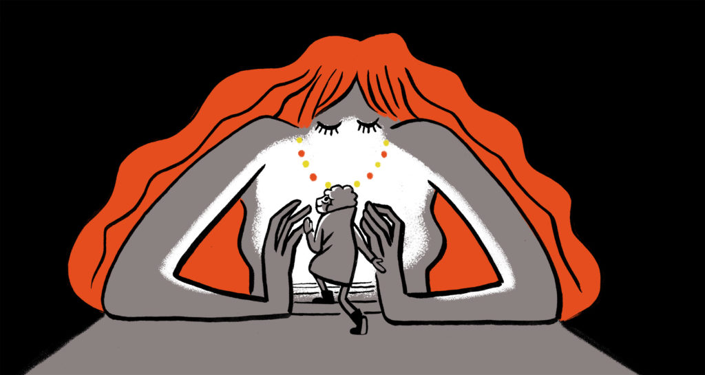Les tentes rouges sont une réponse aux violences gynécologiques et obstétricales et à la misogynie ambiante. Dans son dernier essai sur les sorcières, Mona Chollet rappelle que « La médecine moderne, en particulier, s’est construite le modèle d’une science arrogante, nourrie de mépris à l’égard du féminin, et en lien direct avec la chasse aux sorcières, qui ont permis aux médecins officiels de l’époque d’éliminer la concurrence des guérisseuses ». Lorsque le rituel commence, Vanessa nous demande de nous présenter brièvement, en nous replaçant dans notre matrilinéage. Je pense à ma grand-mère, à ma mère, je bafouille, ne trouve plus le nom de mon arrière-grand-mère, réalise que je ne connais pas les femmes de ma famille. J’ai conscience d’être dans un lieu bienveillant, accompagnée d’autres que je ne connais que depuis vingt minutes mais que j’ai envie d’appeler mes sœurs. Je me sens pleine de compassion et d’empathie : on est dans une vraie galère, mais on est ensemble, et on peut se serrer les coudes. Tout ce qu’on m’a répété sur les femmes entre elles, à se faire des coups de putes ou des crasses, devient une hérésie : c’est un mensonge, puisque nous sommes là toutes ensembles.