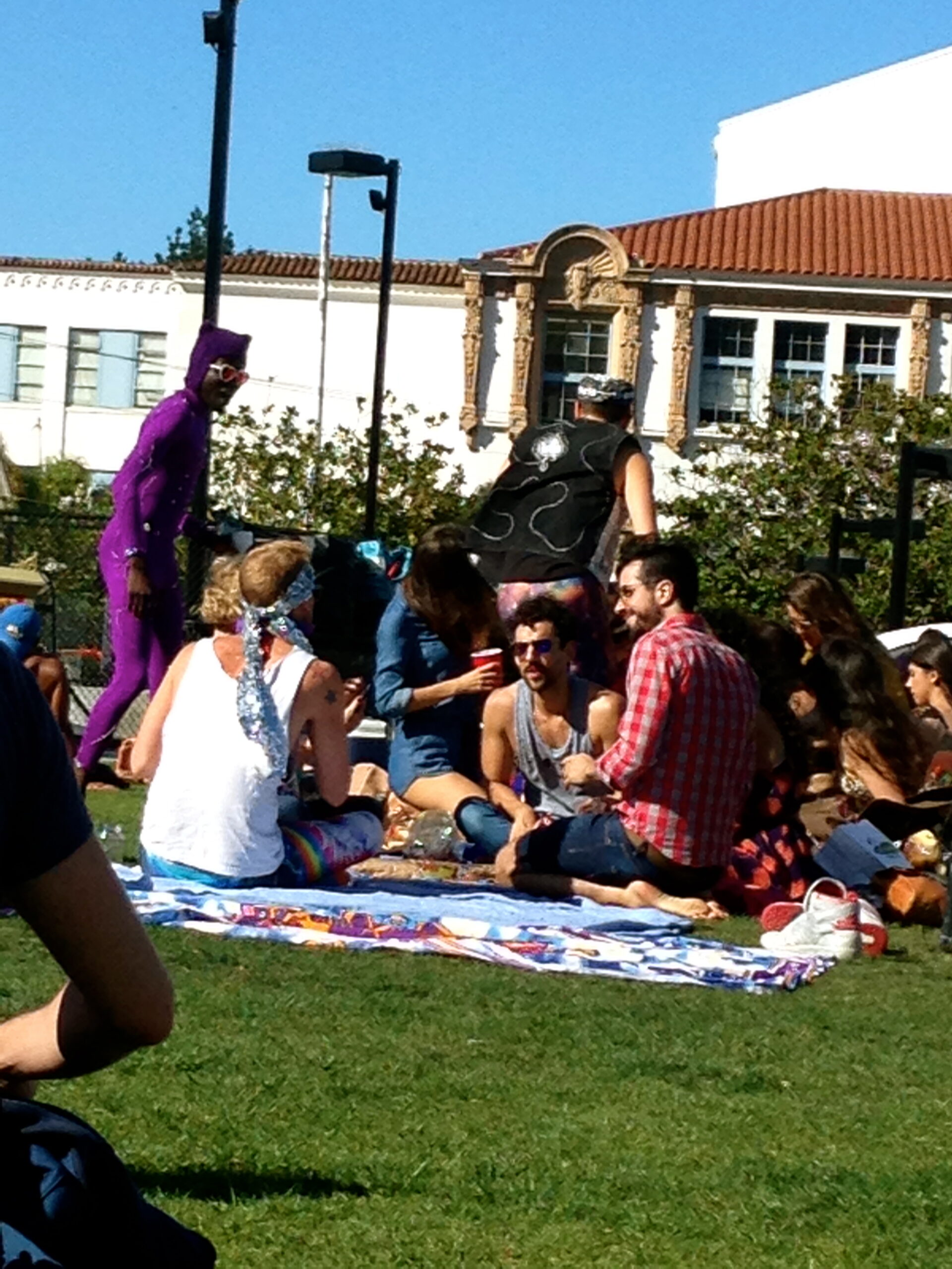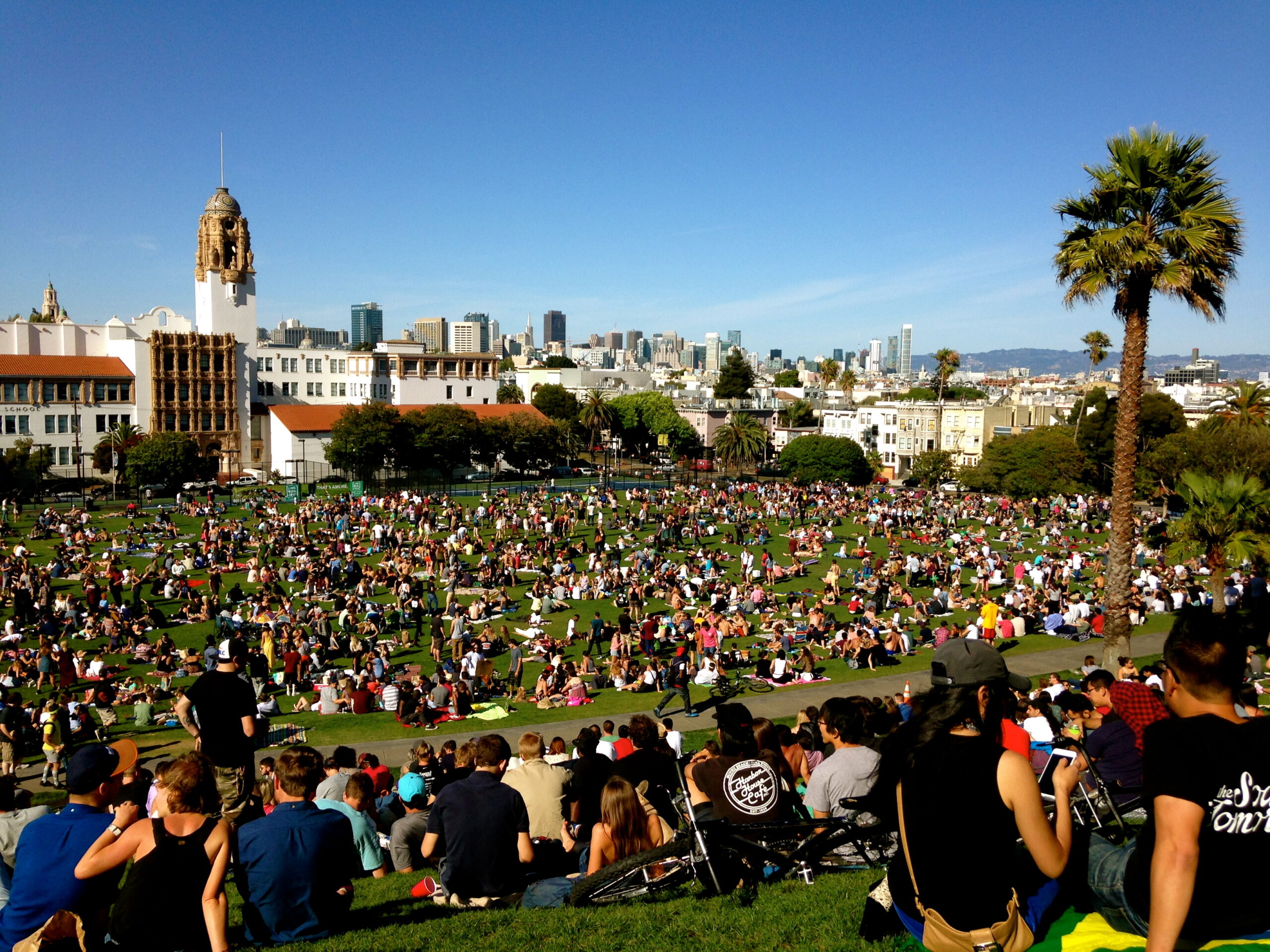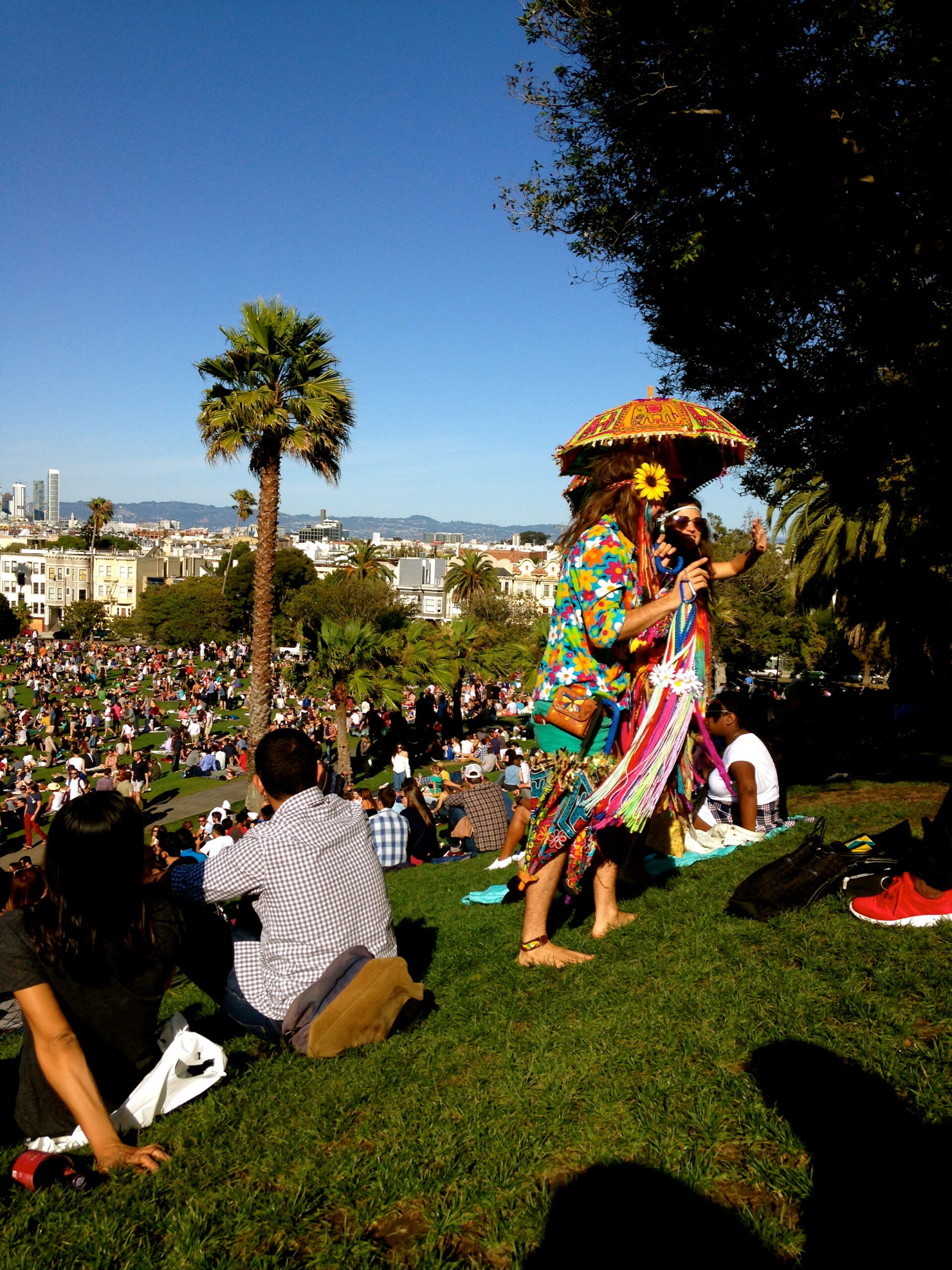 Après cette journée forte en découvertes, je retrouve mon QG du samedi, QG de tous les San Franciscains : Dolores Park. Musiciens, masseurs, gens déguisés, gens sous toutes sortes de substances, hippies de contrebande 2.0 qui vendent des bandeaux souvenirs à fleurs (il y a même un bus de touristes « Hippy », je l’ai aperçu dans le Financial District. Etrange expérience.), je passerais mes six mois ici, sur l’herbe perchée sur la petite colline, à regarder passer la population de cette ville si magique et pleine de contradictions. Sur ce, je vous laisse car on parle, on parle mais en attendant je n’ai toujours pas trouvé la maison bleue adossée à la colline. Français, de 9h mon futur, je vous envoie des milliers de French Kisses.