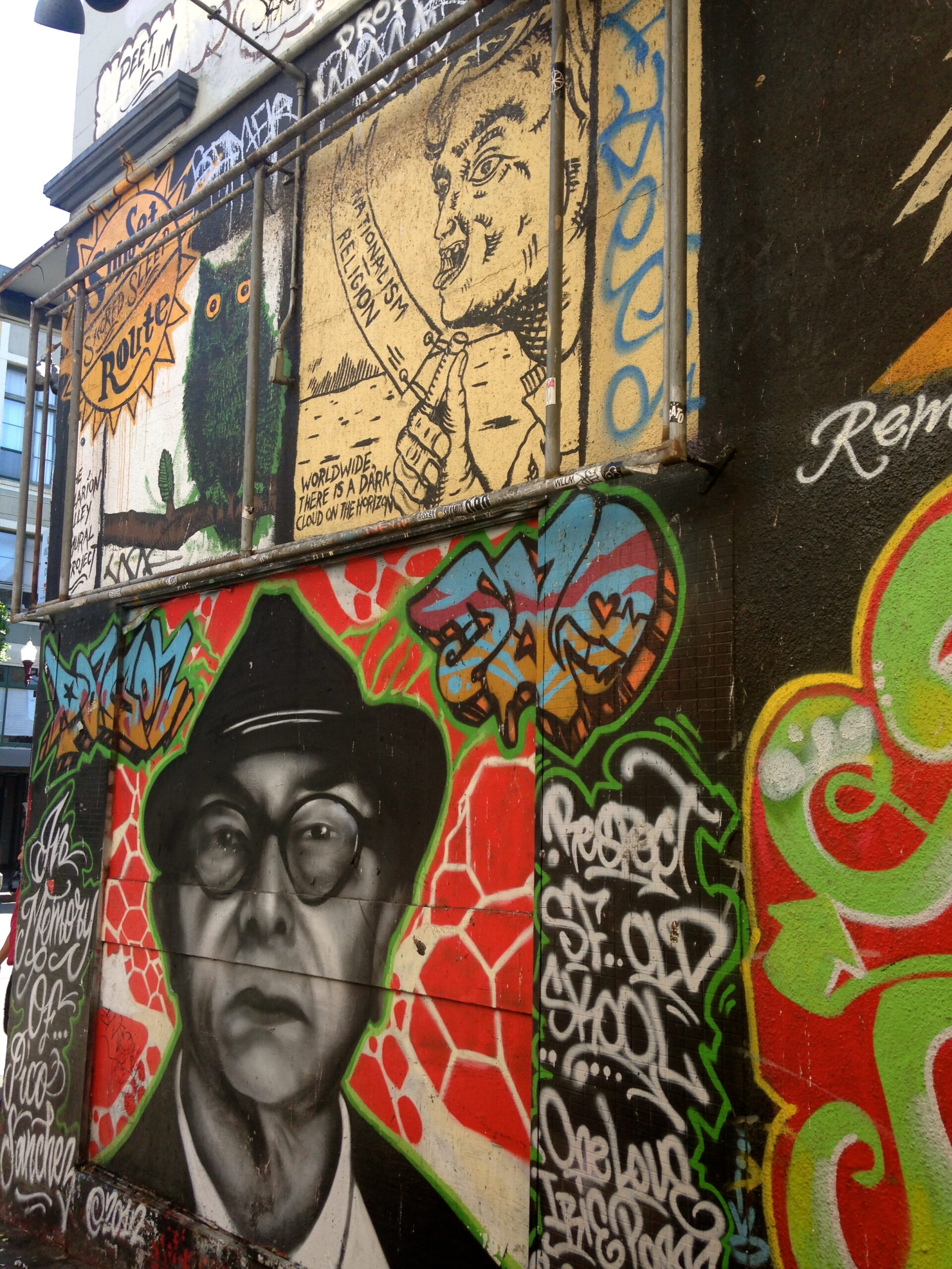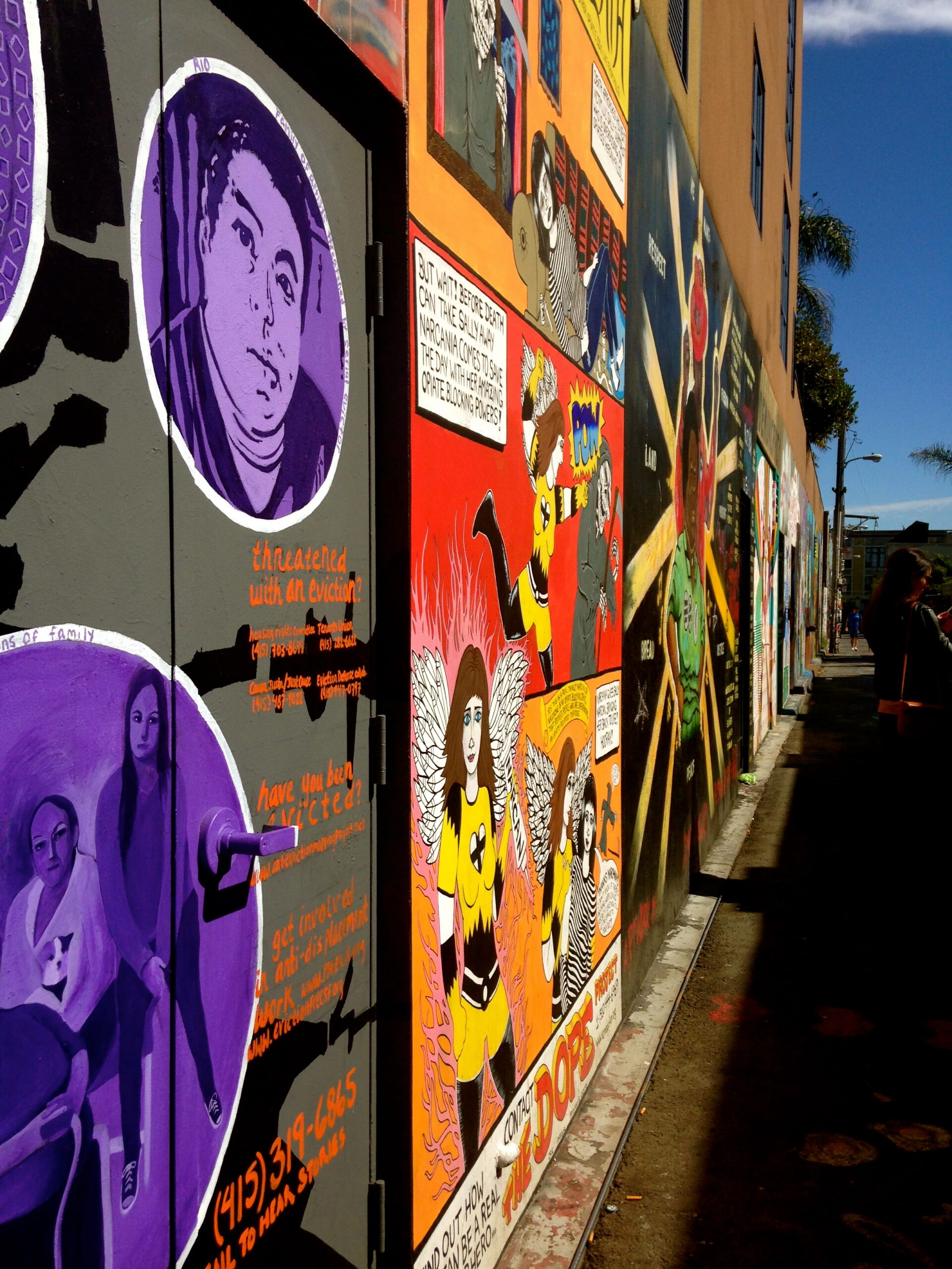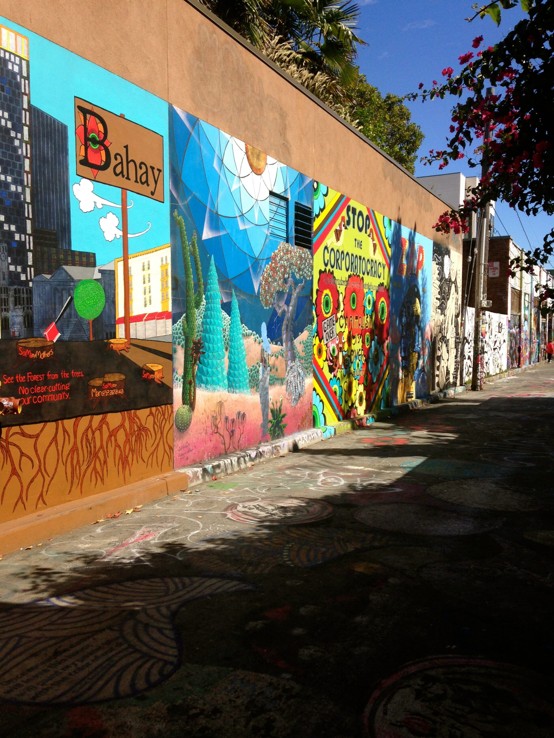 La Balmy Alley représentée sur ces photos, est la plus connue du quartier. Les premières fresques apparaissent au milieu des années 80. Les tags sont régulièrement recouverts pour laisser carte blanche à de nouveaux artistes, de nouvelles inspirations et revendications. C’est comme si cette rue était une sorte de salle d’exposition ouverte à tous, une salle d’expo libre service. Droits de l’homme, gentrification, choix politiques affligeants, discrimination, immigration, système carcéral, port d’armes aux Etats-Unis, tous les thèmes révoltant la population sont abordés dans cette ruelle, véritable porte-parole de plusieurs générations luttant pour la paix et la justice.