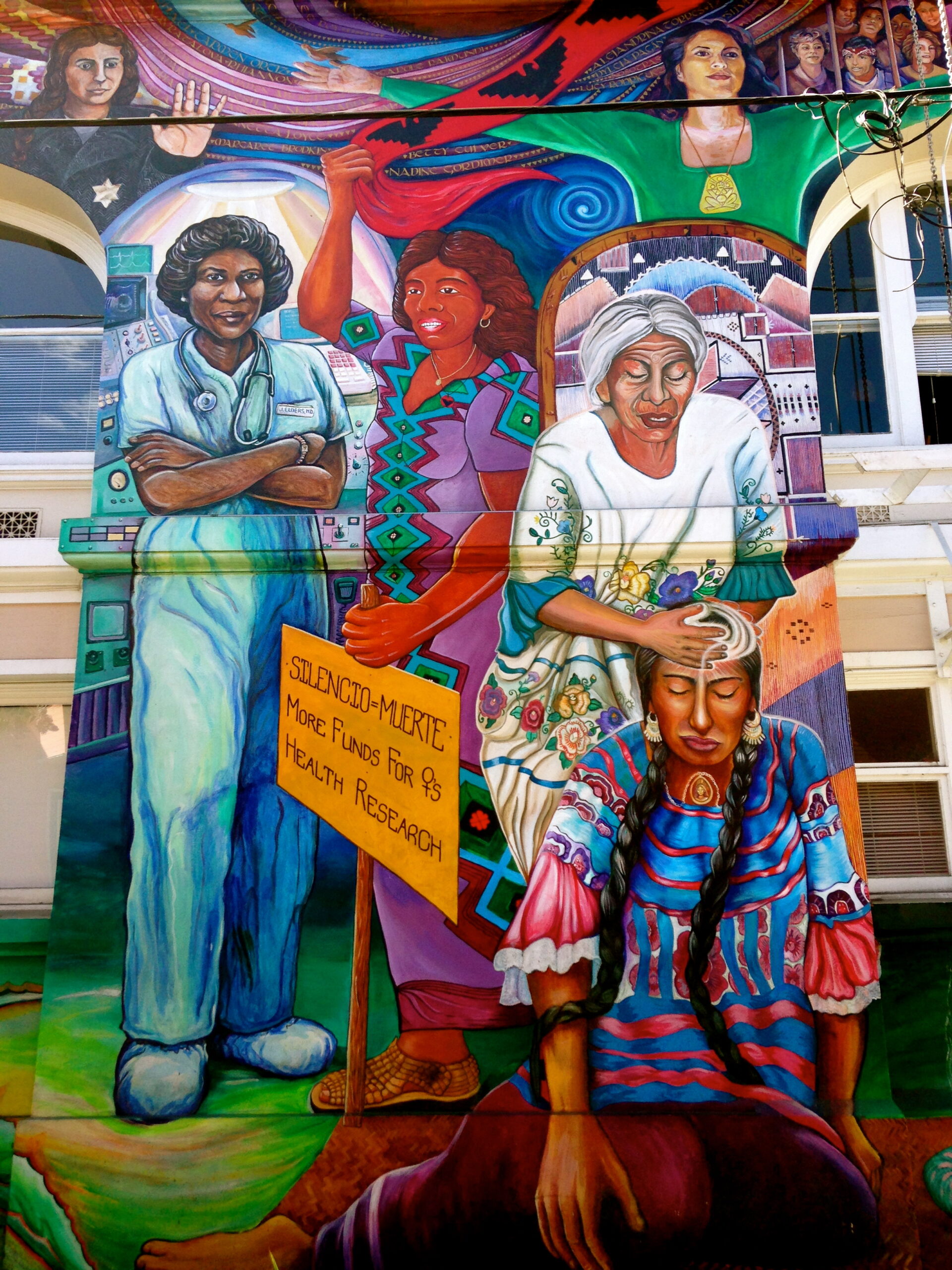 C’est en 1994 (ma date de naissance au passage ! Le 22 décembre, pour être précise si l’envie vous prend de m’offrir un cadeau) que sept artistes Juana Alicia, Miranda Bergman, Edythe Boone, Susan Kelk Cervantes, Meera Desai, Yvonne Littleton and Irene Perez entreprennent cette œuvre gigantesque. Ce monument et ces peintures présentent une ode aux femmes qui, partout dans le monde, ont eu le courage de défendre des causes laissées à l’abandon dans notre société. Il rend hommage à celles qui ont fait l’histoire (on reconnaît notamment Rigoberta Menchu) et qui la feront encore. Ce n’est pas tout, il agit en prolongeant concrètement ces causes en aidant des femmes qui en ont besoin.