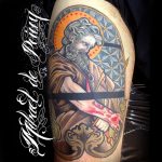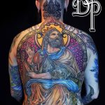 De la même manière, Mikaël de Poissy transpose la technique du vitrail au tatouage, créant sur de larges surfaces de peau d’immenses représentations de vitraux médiévaux, dont les motifs colorés figurant des personnages saints sont délimités par de larges traits noirs s’assimilant aux baguettes de plomb qui maintiennent les pièces de verre des vitraux.