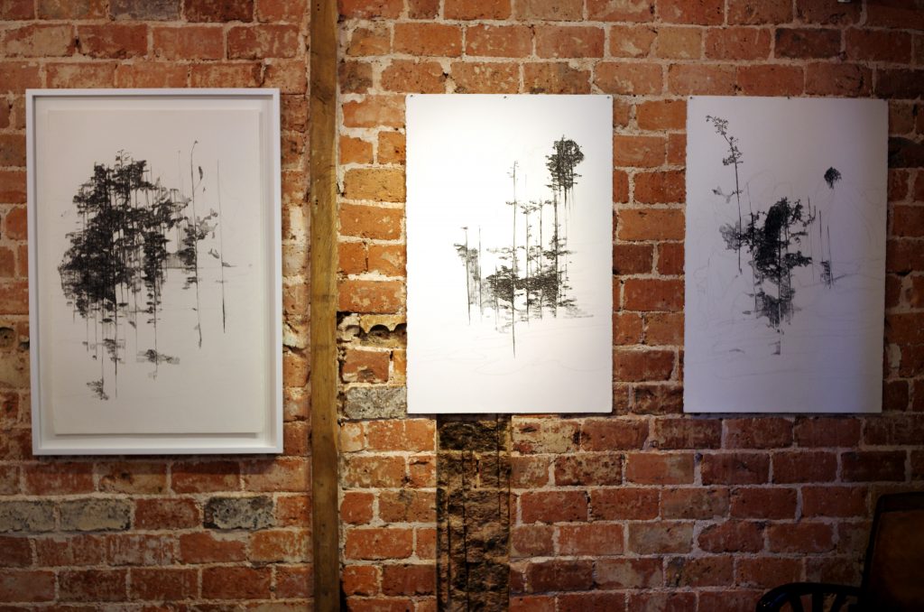 Une photographie panoramique est agrandie pour l’exposition à la galerie. Cette image qui hante l’artiste depuis deux ans a donné lieu à toute une série de travaux autour d’arbres qui restent en suspens dans l’espace de la feuille. « Les lignes qui sont autour signifient l’espace qui aurait pu être plein mais qui est resté vide » nous dit Nathalie. Selon Deleuze, une toile n’est jamais vide et une page n’est jamais blanche avant d’être remplie : elle est déjà pleine, pleine du pire…