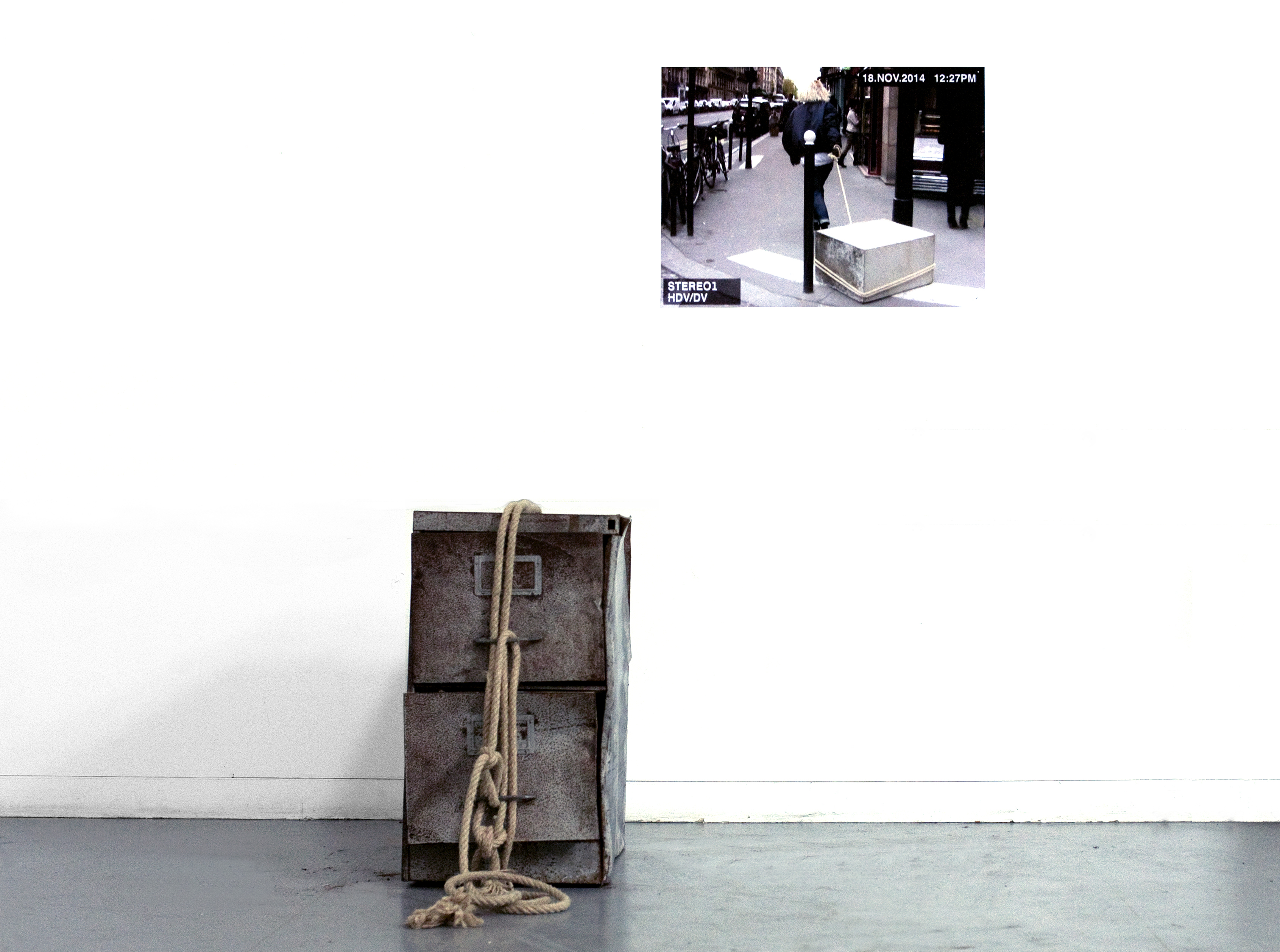 L’installation Transfert (2014) en est l’exemple parfait : l’artiste traîna un meuble de métal du nord au sud de Paris et filma le voyage, mais il n’expose que le meuble, trace de l’action, et une capture d’écran, trace de la vidéo. Tour à tour performance, vidéo, photographie, sculpture et installation, ce qu’il en reste est un langage sobre, post-minimaliste, et les passages d’une technique à l’autre permettent de dépasser l’action et de créer, comme dans Esperanto, une fiction autour de la confrontation entre le corps et l’espace social.