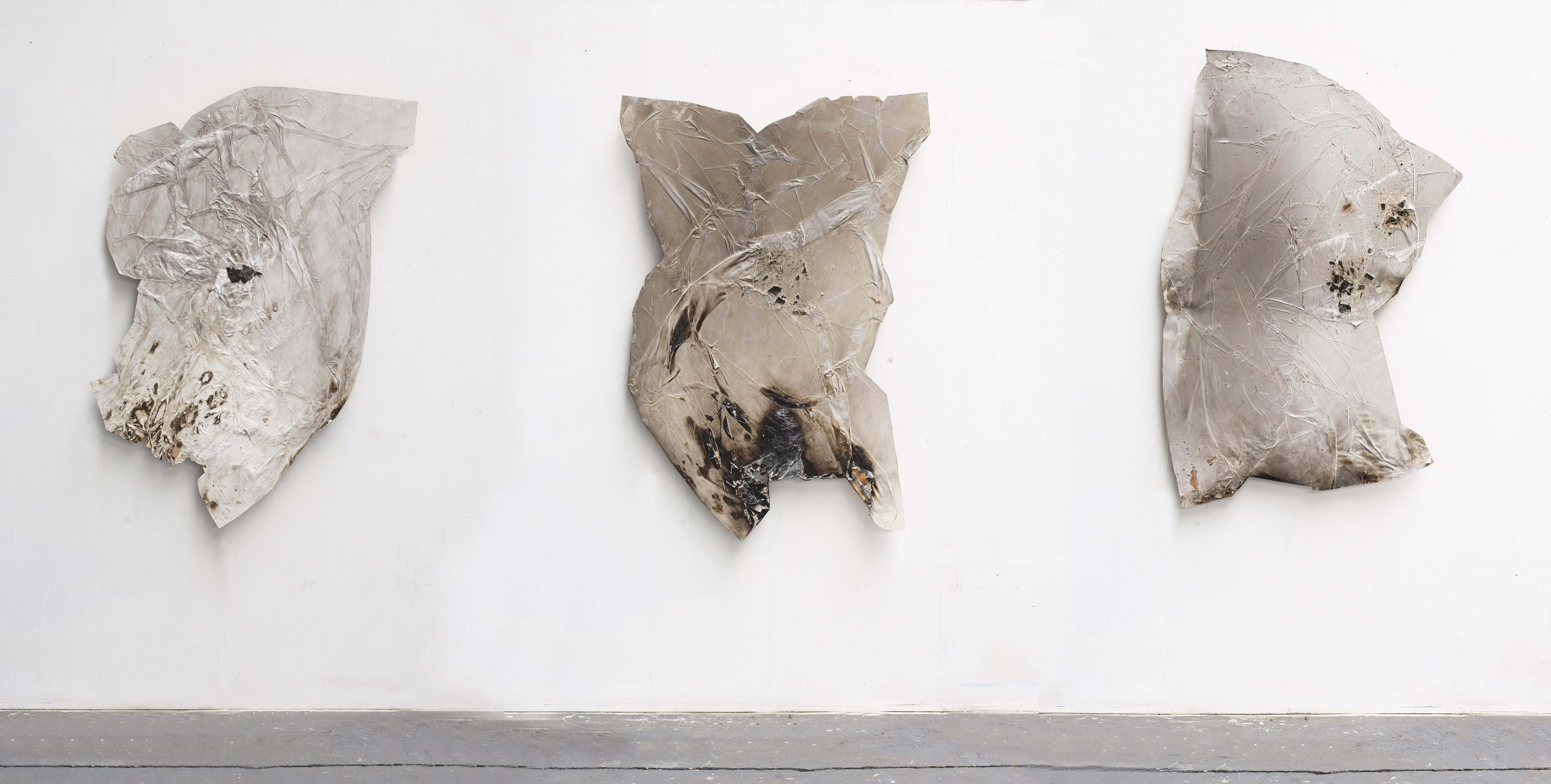 On remarque une confusion parallèle dans la série d’œuvres Esperanto (2015 et 2016). En lien aussi avec l’état d’urgence, les œuvres sont faites à partir d’affiches de manifestations vierges, transformées sous l’effet des cocktails Molotov lancés par l’artiste.