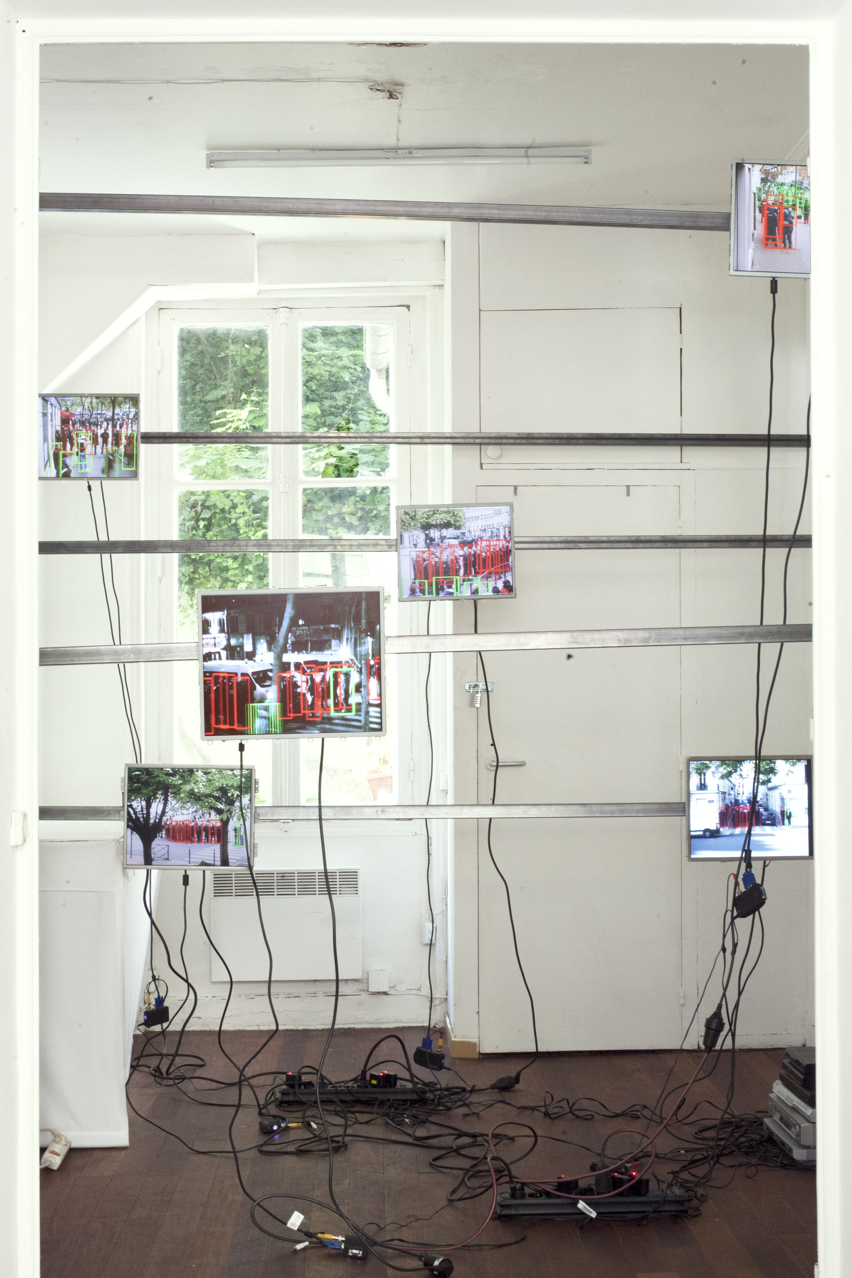 L’installation De la surveillance aux surveillés est composée de six écrans qui nous font face. Ils diffusent les vidéos de groupes de CRS immobiles en train d’encadrer des manifestations enregistrées à six mètres de haut, comme des vidéosurveillances. Un algorithme de détection des comportements anormaux ressemblant à ceux des forces de l’ordre est appliqué aux images, créant des cadres verts, puis rouges, pour marquer le danger… et le rouge n’encadre que les policiers !