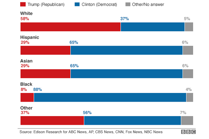 Ceux qui ont élu Trump ont voté pour une promesse : « Make America Great Again ». Mais ce ne sont pas tous des hommes, Blancs, ils ne sont pas tous vieux, ils ne sont pas tous stupides. 42% des femmes qui sont allées voter ont choisi Trump malgré ses propos sexistes ; 29% des Hispaniques ont voté pour le candidat républicain malgré ses propos racistes ; 37% des jeunes de 18 à 25 ans l’ont choisi malgré l’écart générationnel. Le propos de Trump ne séduit pas que les ignorants. Les premiers sondages montrent que 54% des hommes diplômés (à l’université) et 45% des femmes diplômées ont choisi Trump. Ils adhèrent à une ou plusieurs propositions du candidat et surtout détestent Hillary Clinton.
