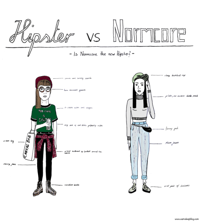 A première vue, le look normcore pourrait ressembler à une évolution du hipster. Ce dernier, se distinguant par un refus maladif de la culture mainstream et la recherche d’un style indépendant, puise son inspiration dans des codes vestimentaires et culturels préexistants, qui, associés avec le street style contemporain, deviennent « hype ».