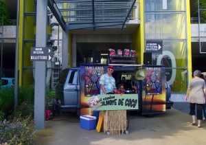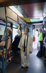 Je m’installe dans le bus, curieuse mais méfiante. Et si c’était le concert d’Alain Souchon et Laurent Voulzy et que je me retrouvais prise au piège ! A ce moment, je ne connaissais même pas la liste des artistes qui proposaient des concerts secrets. Au cours de ce trajet, j’en apprendrai beaucoup sur moi-même et ma crédulité. J’avais beau avoir lu que des compagnies de théâtre faisaient des performances dans les navettes quelques jours auparavant, quand je me suis retrouvée en face d’un mec avec un cordon enroulé autour du visage et un regard pervers, j’y ai cru.
