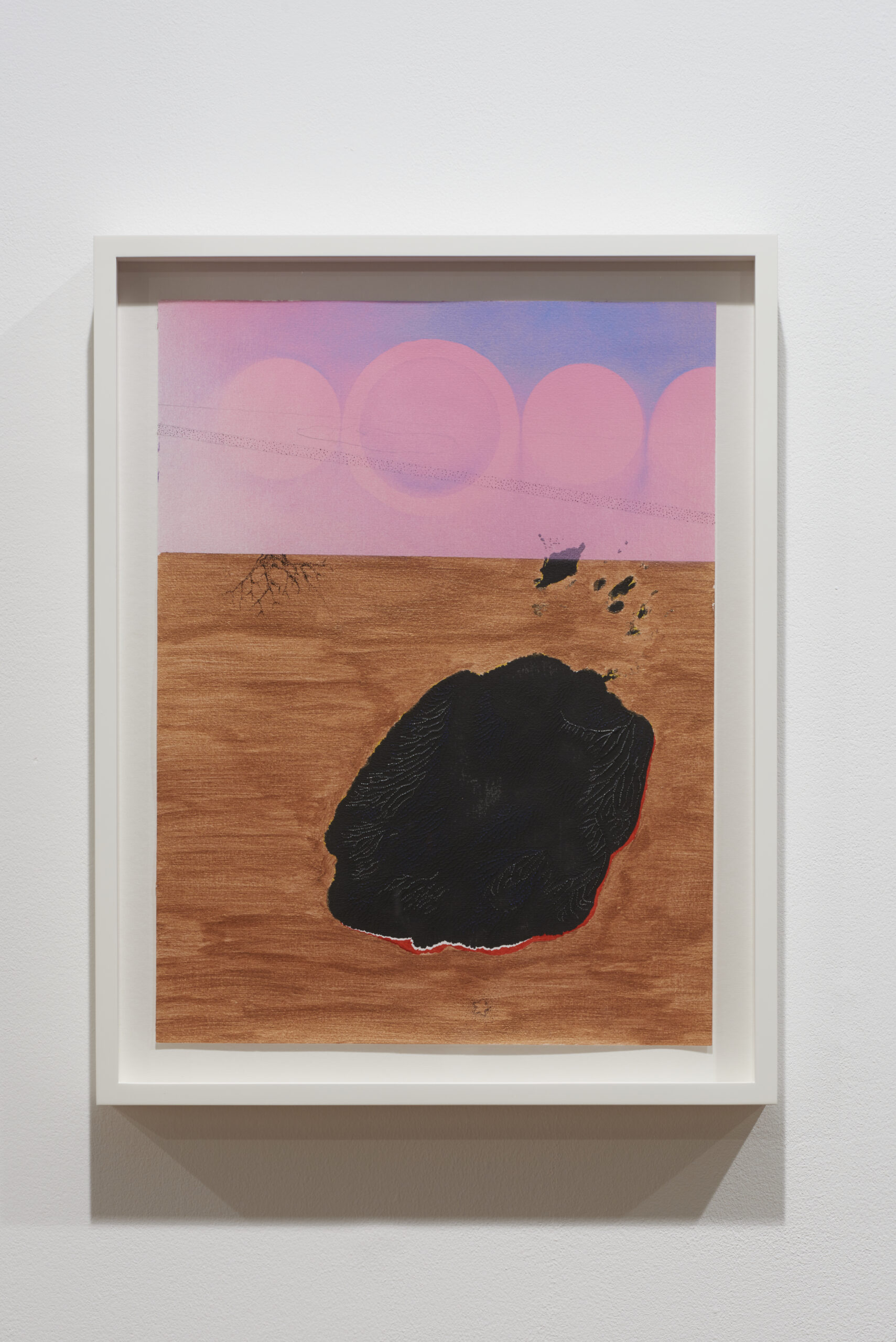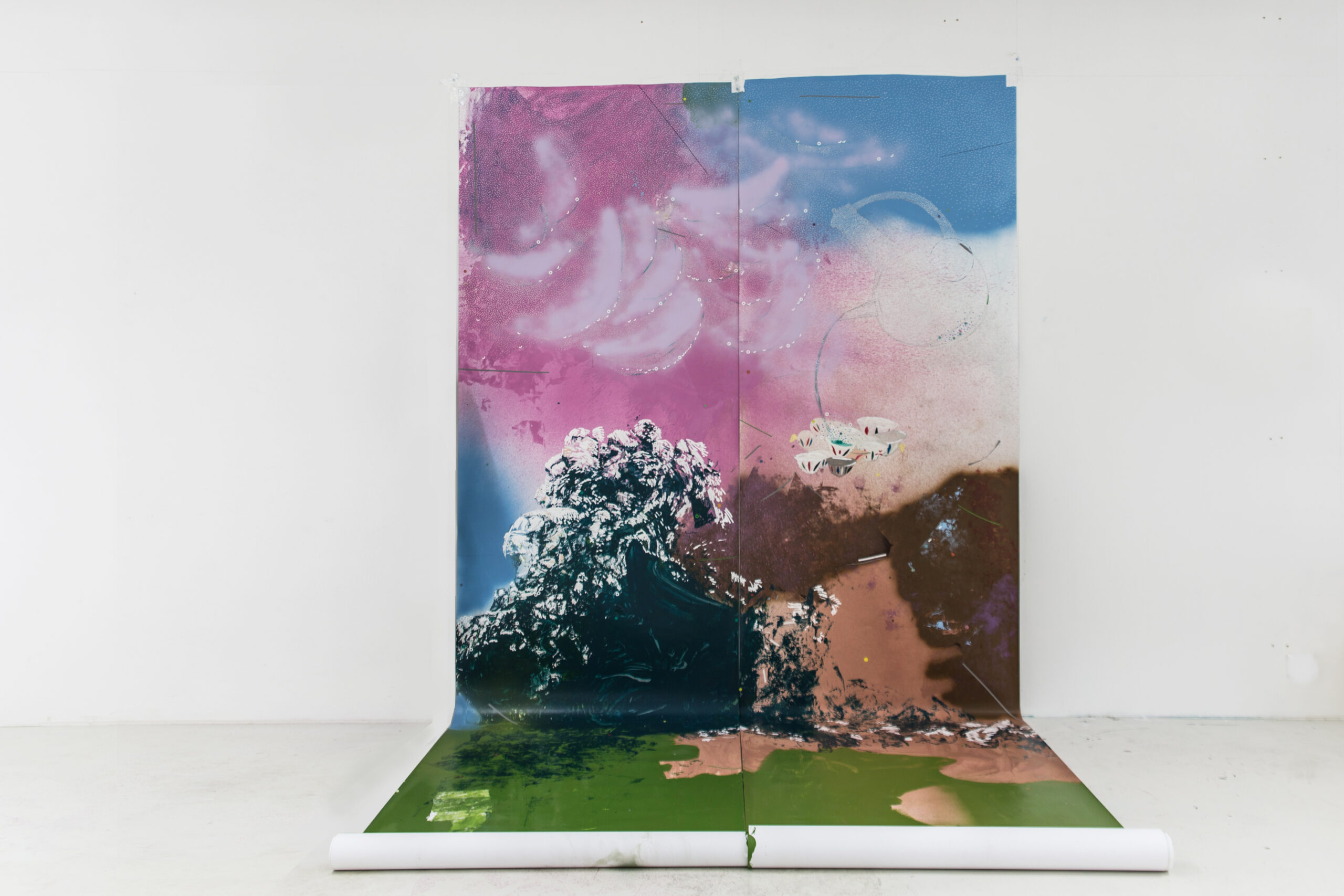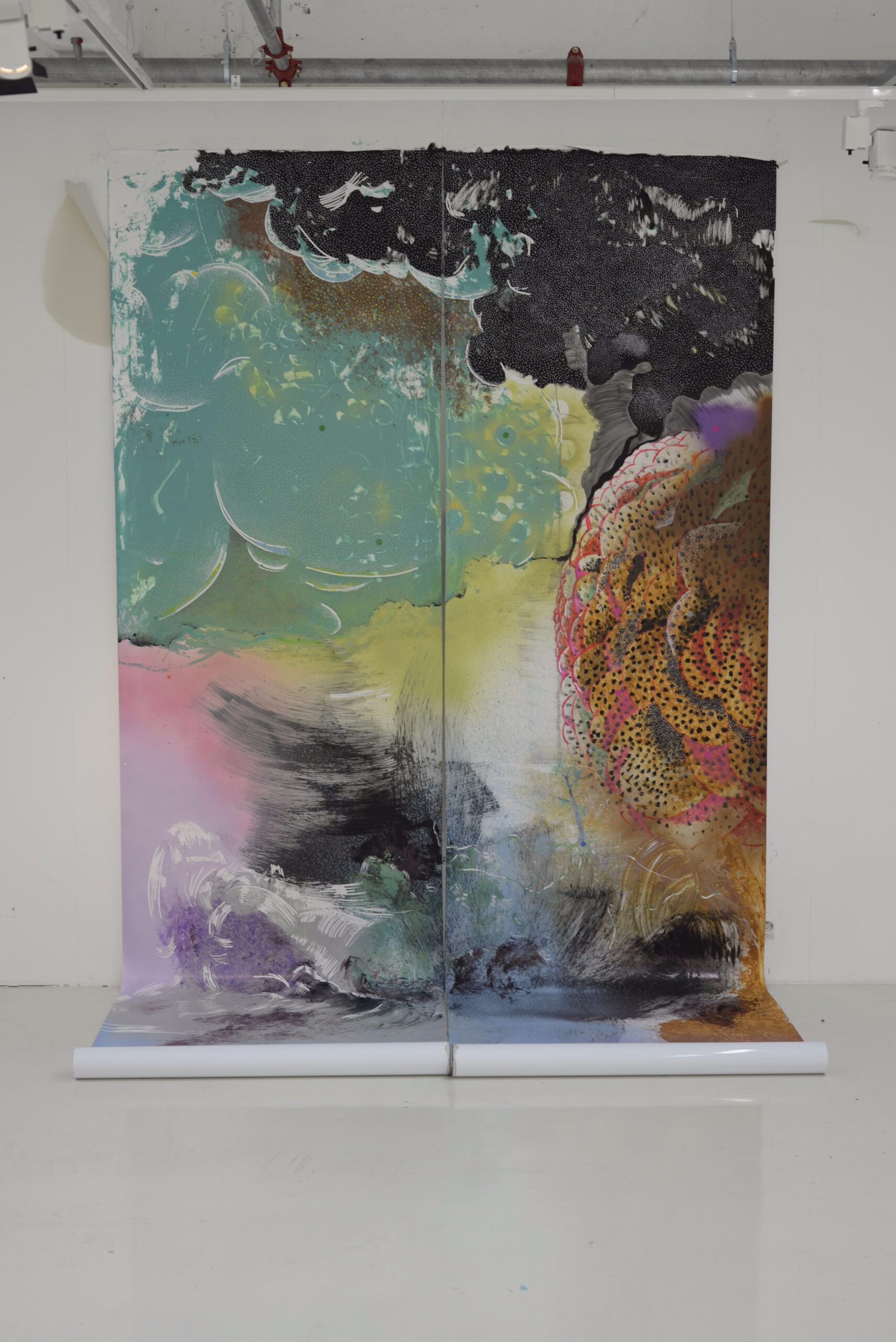 En effet, on peut distinguer dans ces œuvres des motifs tout droit sortis d’un paysage désertique et montagneux du nord de l’Éthiopie, où l’artiste a grandi. Mais quels étranges paysages ! Un arbre aux branches tortueuses devant une lune opalescente rappelle les paysages romantiques d’un Caspar David Friedrich. Une vague avec son écume dentelée évoque, quant à elle, celle d’Hokusai, tandis que le support se présente sous la forme d’un rouleau, à la manière des estampes japonaises.