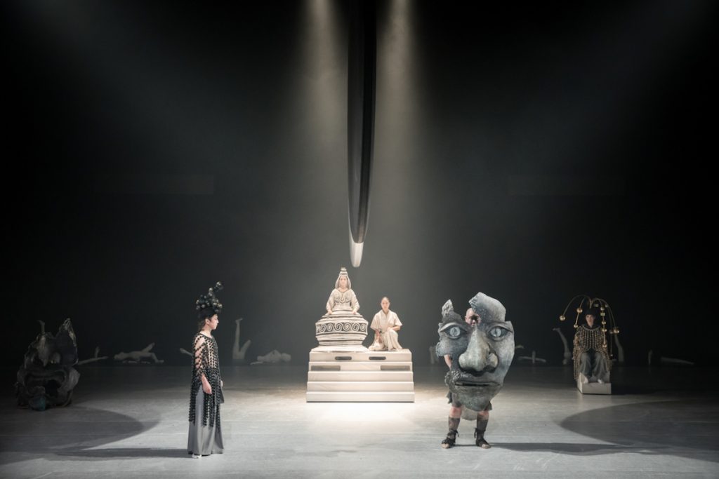 A cette question épineuse, Léonora Miano, auteure franco-camerounaise qui écrit autour de ce qu’elle nomme « les silences de l’histoire » (1), répond en s’affranchissant de la binarité des solutions proposées : en confiant la mise en scène de Révélation, premier volet de sa trilogie Red in Blue, à l’artiste japonais Satoshi Miyagi, elle convoque un univers mythologique élargissant le champ des possibles et transpose le sujet à une culture tout autre… dans un double mouvement, puisqu’un récit sur l’expérience subsaharienne de la déportation transatlantique (vers l’Ouest donc) se voit lui-même déplacé vers l’Orient.