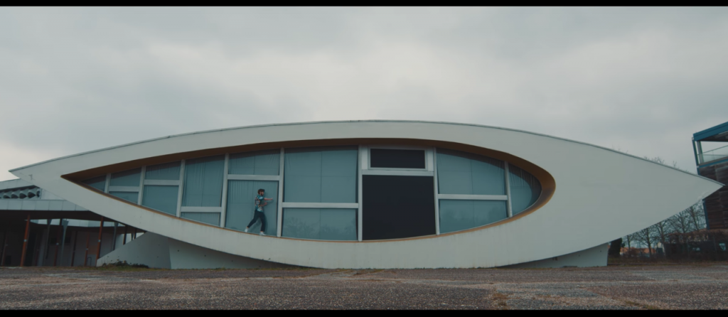 Pas dans la rue, mais sur la dalle. Sur la dalle d’un urbanisme typique des années 1970, le complexe architectural moderne dit brutaliste. Révérence est donc cet homme affecté d’une frustration, assumant sans rancœur sa vulnérabilité, et peut-être sa défaite, dans les formes géométriques bétonnées d’une ville abandonnée, collant son corps aux poteaux et aux vitres d’immeubles solides et vides et tournoyant dans le réceptacle plat d’un ancien bassin de rétention d’eau.
