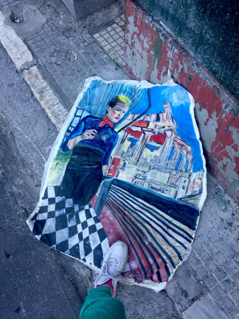 Oui c’est vrai, dans Athènes I love U par exemple j’ai voulu que la toile vive dans la rue, qu’elle s’imprègne de la ville, qu’elle soit marquée par celle-ci. Ce tableau est lié à ma permanence à Athènes l’année dernière : on me voit à côté de l’Acropole avec une canette de Coca.