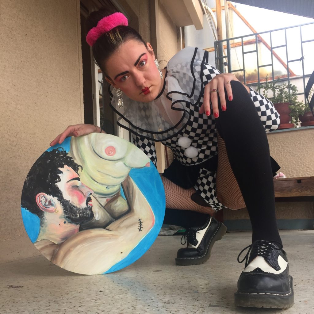 Mais oui, parlons-en du sexe. J’évolue dans un monde où les hommes ont encore le dernier mot. Quand tu es femme c’est difficile d’exister en tant que femme-artiste. Les profs et les artistes hommes qui m’entourent me suggèrent souvent d’exhiber mon corps nu, de me peindre comme la femme qu’eux fantasment. Ou alors carrément ils me prennent pour une conne. Mais c’est quelque chose que j’aime beaucoup, me faire prendre pour une conne. C’est fou à quel point mon personnage hyper féminin influence un jugement sur mon intelligence.