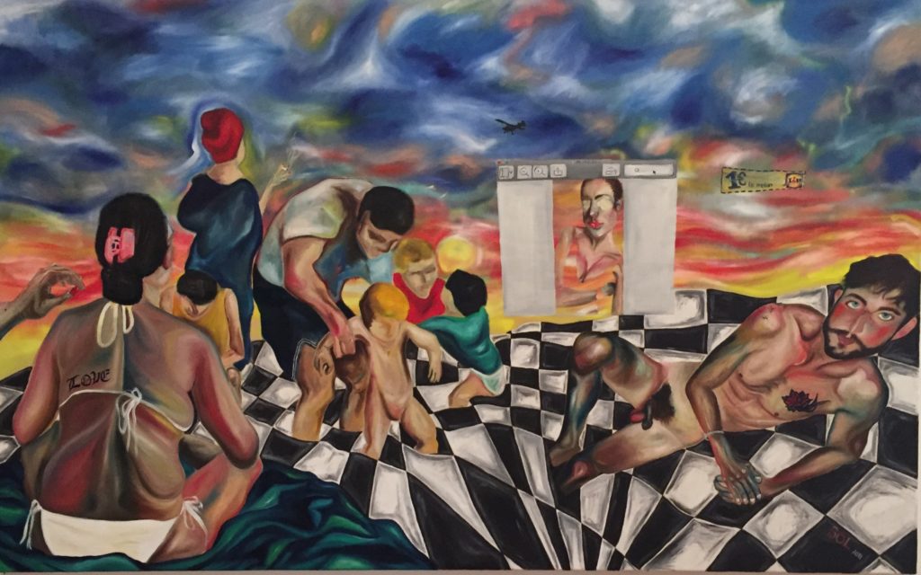 Oui, je me mets dans la situation dont j’ai rêvé. Mais ce « moi » n’est pas vraiment non plus partie prenante de la scène du tableau. Il participe extérieurement. Oui c’est un peu comme se prendre en photo, je prends pas mal de selfies d’ailleurs. C’est comme quand tu es petite et que tu te regardes dans un miroir : tu te poses la question de savoir si les autres te voient de la même façon que comment toi tu te vois. Avec la peinture je me suis créé ma propre image, celle que je veux donner aux autres, c’est une réappropriation de mon corps.