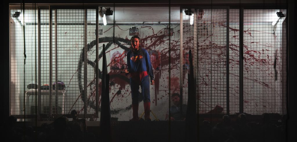 Le public ne demeure pas en reste de ce tourbillon d’événements : à l’occasion d’un pastiche de téléréalité, il sera invité à monter sur scène, devenant à part entière un acteur de cette société en déroute. Une présentatrice rousse survoltée (interprétée par la brillante Candice Bouchet) anime l’émission. Il s’agit de tuer en direct le monarque immortel, déjà bien mal en point et enfermé pour l’occasion dans une sinistre cage carrelée . Jusqu’à l’aboutissement du crime, on suivra à la caméra l’heureux candidat, retransmis sur écran géant et acclamé par une foule encensée s’agitant au rythme des derniers tubes – car, comme le déclare l’un des personnages de la pièce, à défaut de pouvoir sauver un pays, il faut le divertir.