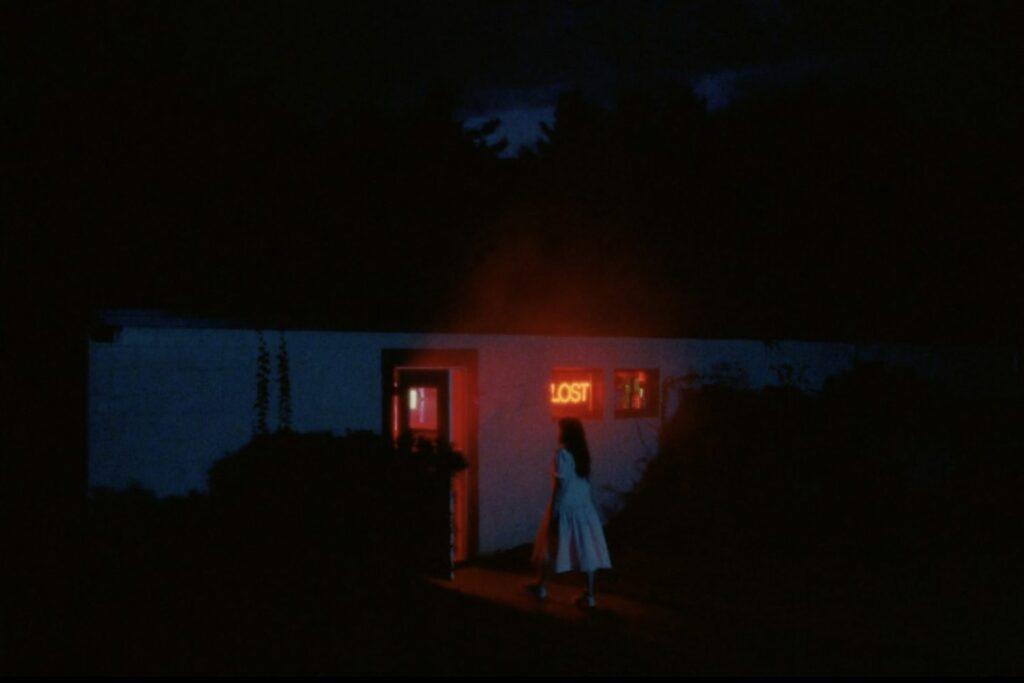 C’est l’actrice Kristina Esfandiari, le regard brûlant et droit, qui campe le personnage principal de cette épopée. Baskets ensanglantées, innocence apparente et désir de fuite en ligne de mire. Sa figure centrale vient faire écho à la partie documentaire du film dans laquelle on suit le duo Boy Harsher en production / live. Jae Matthews vient alors laisser entendre une forme d’identification face à la détresse de cette femme perdue et tourmentée qui n’arrive pas à aller contre ses pulsions destructrices. Cette construction en deux parties parallèles – entre live et fiction – crée une imbrication judicieuse. La musique s’invite par les médiums mis à disposition dans le décor de l’intrigue, comme les écrans cathodiques ou des enceintes. Un monde à la fois proche et lointain.