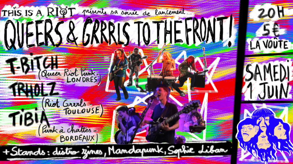 Pour sa soirée de lancement, THIS IS A RIOT nous offre une belle soirée à son image, entre rage et paillettes. Niveau programmation musicale, on retrouvera T-Bitch pour son queer riot londonien, Trholz pour poursuivre dans l’énergie, cette fois-ci de Toulouse, et enfin Tibia, punkeuses bien connues de Bordeaux. Au milieu de tout ce joyeux bazar, il y aura du zine, de l’illustration, de la création à ne plus savoir où donner de la tête. On se dépêche d’aller soutenir l’initiative, parce que des espaces safe comme ça, on ne crache pas dessus.