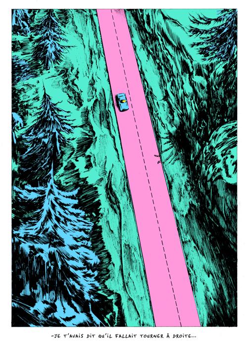Mes parents étaient très classiques, il y avait des livres d’art partout à la maison ; j’ai vécu dans plusieurs pays, au Tchad, au Guatemala, puis au Mexique. J’étais au Mexique entre mes 10 et 15 ans, et j’y voyais des peintures sur les murs, rouges, roses, jaunes, et je pense que ma manière de faire de la couleur vient de là. Mon dessin vient du classicisme, de ce que j’adorais chez les grands peintres. J’essaie de tendre vers un grand réalisme, avec en contrepoids une couleur éclatante. Avant, je ne faisais que du noir et blanc, c’était cool mais il me manquait de l’impact, je voulais faire entrer de la lumière, de la réalité. J’ai beaucoup cherché, j’ai testé les camaïeux de gris, sans résultat, et à force j’ai trouvé une manière de faire de la couleur, j’ai trouvé le moyen de la mettre au même niveau que le trait, et pas en-dessous. Pas de duel entre le trait et la couleur. La couleur vient donc du Mexique, des comics aussi – mes parents avaient des illustrés des années 1950.
