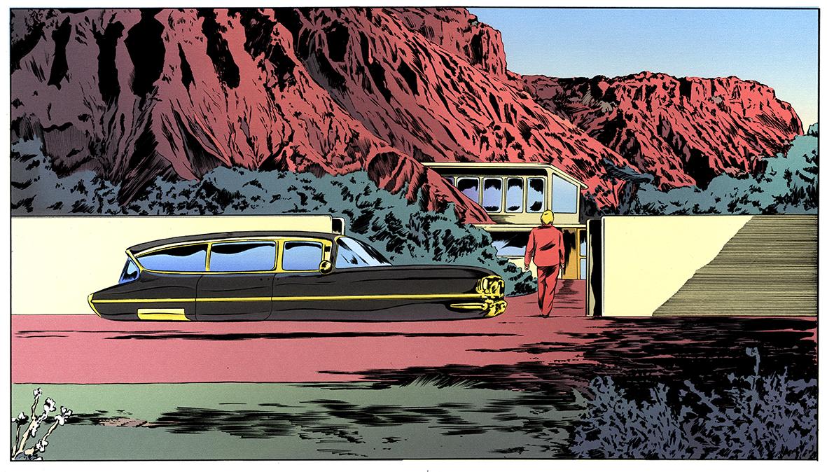 Pour moi, le futur est comme l’enfer. L’image que l’on a de l’enfer est restée au Moyen Âge, on imagine des chaudrons, etc. La vision du futur s’est développée avec Jules Verne, une des images était extrêmement optimiste, puis une autre a suivi, étrange, avec des monstres. Moi, j’aimais la vision décorative du futur, un peu naïve, avec des voitures volantes et des formes très rondes, épurées. Les designs de la Buick, des vieilles Chevrolet me parlent. J’ai compris les voitures quand j’ai compris la science-fiction. Je n’ai pas le permis, je n’aime pas les voitures, mais j’ai découvert là l’intérêt graphique des voitures. Elles ont un intérêt narratif fou, pour raconter le personnage. Je me rappelle la sensation que j’avais pendant certains trajets, pour moi la voiture est un lieu de nostalgie, de musique.