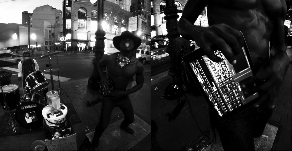 Pressés, dans notre bulle, fixant loin devant nous pour se frayer un chemin dans la foule folle de nos cités modernes, rares sont les instants où nous nous arrêtons, sauf pour consommer. Si proches des gens qui nous frôlent et se faufilent, et pourtant si isolés nous sommes. Nous oublions qu’une rue n’est pas seulement un lieu de transit, de passage d’un point à un autre. La rue est un lieu à part entière, un lieu d’art et de culture, un espace de partage et un partage de l’espace. Certains donnent le tempo à nos marches chaussés de talons ou de baskets grâce à la musique et la danse qui résonnent entre la verticalité des interminables buildings. Et pourtant, notre attention est capricieuse. Ce jour-là, comme tous les week-ends quand je passe par Powell St. & Market St. pour aller à Oakland, j’ai vu ce groupe singulier utilisant batterie, tablette iPad et claquettes comme instruments, je me suis dit : arrête-toi, fige le temps, regarde, car finalement la musique s’offre à nous dans un spectacle urbain. Ça n’a pas manqué, loin des clichés de l’artiste de rue dont on a pitié, j’ai découvert des passionnés, du funk, un incroyable danseur, un citoyen politiquement engagé, un athlète à l’hygiène de vie irréprochable et véritable mordu de technologie… J’ai rencontré Edward Jackson & Urban Funk Machine.