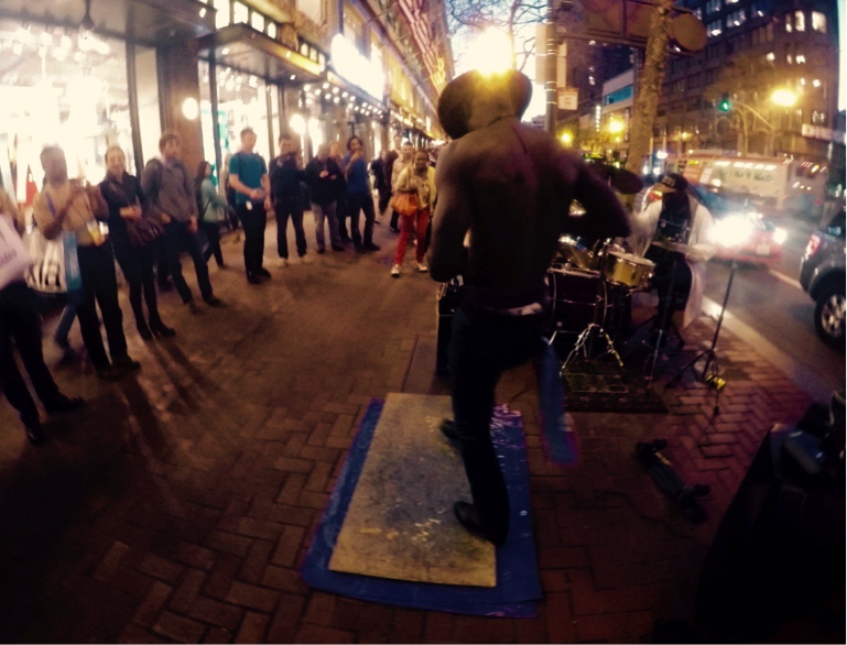 Pressés, dans notre bulle, fixant loin devant nous pour se frayer un chemin dans la foule folle de nos cités modernes, rares sont les instants où nous nous arrêtons, sauf pour consommer. Si proches des gens qui nous frôlent et se faufilent, et pourtant si isolés nous sommes. Nous oublions qu’une rue n’est pas seulement un lieu de transit, de passage d’un point à un autre. La rue est un lieu à part entière, un lieu d’art et de culture, un espace de partage et un partage de l’espace. Certains donnent le tempo à nos marches chaussés de talons ou de baskets grâce à la musique et la danse qui résonnent entre la verticalité des interminables buildings. Et pourtant, notre attention est capricieuse. Ce jour-là, comme tous les week-ends quand je passe par Powell St. & Market St. pour aller à Oakland, j’ai vu ce groupe singulier utilisant batterie, tablette iPad et claquettes comme instruments, je me suis dit : arrête-toi, fige le temps, regarde, car finalement la musique s’offre à nous dans un spectacle urbain. Ça n’a pas manqué, loin des clichés de l’artiste de rue dont on a pitié, j’ai découvert des passionnés, du funk, un incroyable danseur, un citoyen politiquement engagé, un athlète à l’hygiène de vie irréprochable et véritable mordu de technologie… J’ai rencontré Edward Jackson & Urban Funk Machine.
