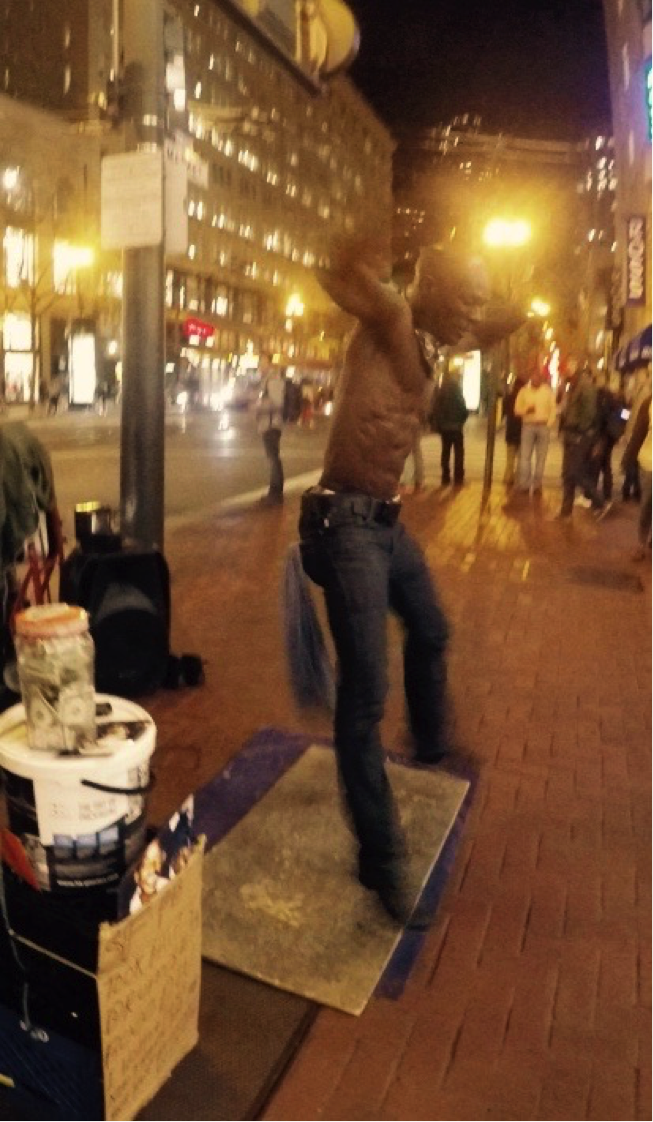 Nous commençons la conversation en parlant politique américaine. Nous échangeons sur la performance et le message politique de Beyoncé pendant le Super Bowl (on commente d’ailleurs une caricature qu’il aime beaucoup représentant Beyoncé sur une panthère le poing levé), du coût exorbitant du même évènement au détriment des sans-logis de San Francisco chassés et ne bénéficiant pas de ce même argent promis par le maire de San Francisco pour améliorer leur situation dans une ville devenue cité de yuppies. Durant une de ses performances quotidiennes, il porte une écharpe aux couleurs du drapeau afro-américain, il me montre la photo et m’explique la signification des couleurs que j’ignorais.