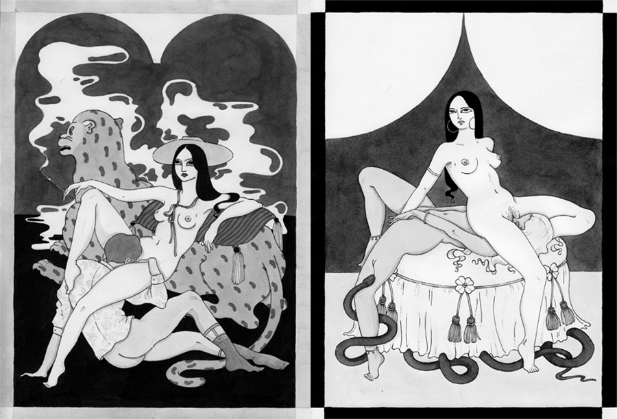 Anna : Oui, bien sûr, il y a une dimension très onirique dans ce travail. Nous avons souhaité qu’autant dans les dessins que dans les textes, tout le monde puisse se reconnaître, trouver un érotisme universel par le conte. La nature, les monstres, ce cadre qui fait déborder sur le rêve permet à hommes, femmes, hétérosexuels, homosexuels, vieux ou jeunes, de fantasmer.